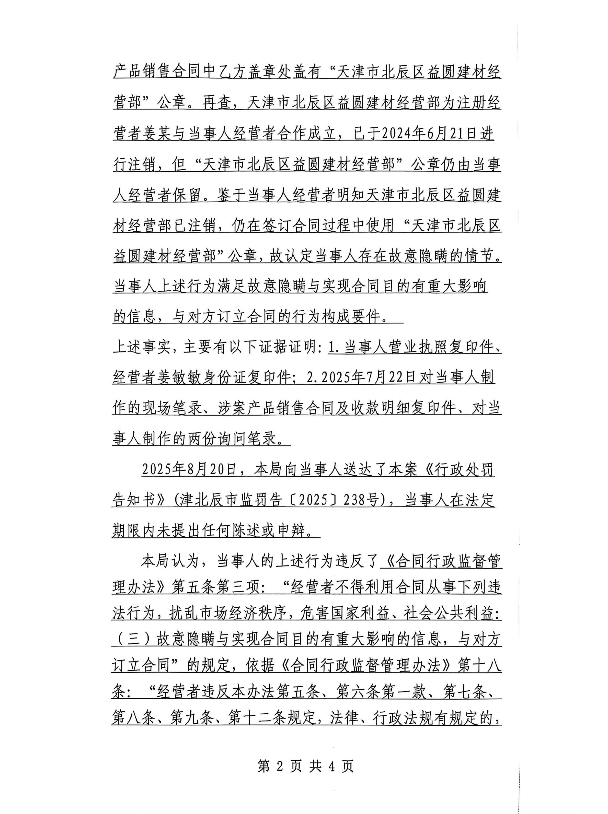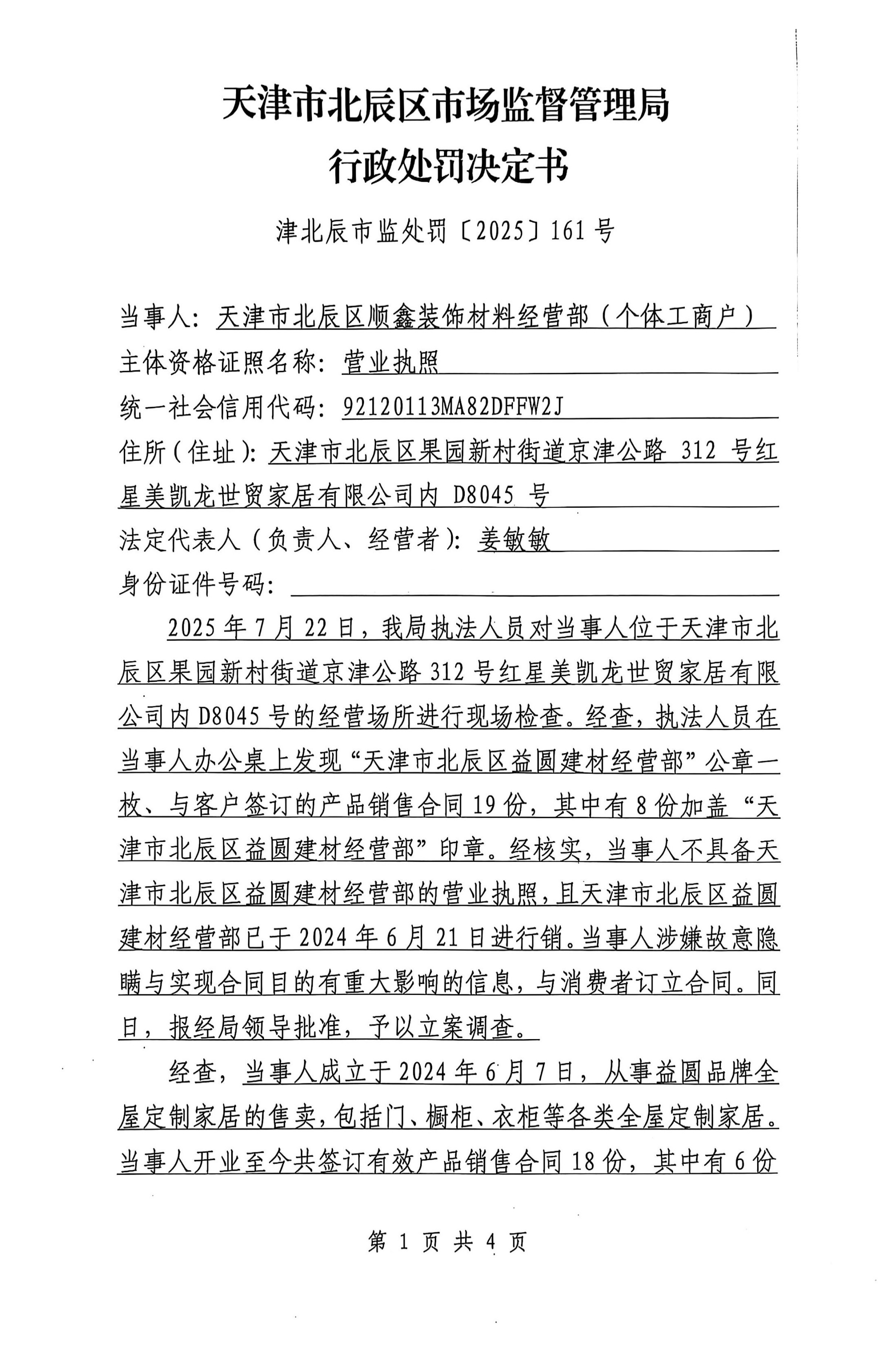 津北辰市监处罚〔2025〕161号-天津市北辰区顺鑫装饰材料经营部故意隐瞒与实现合同目的有重大影响的信息,与对方订立合同的行为案
