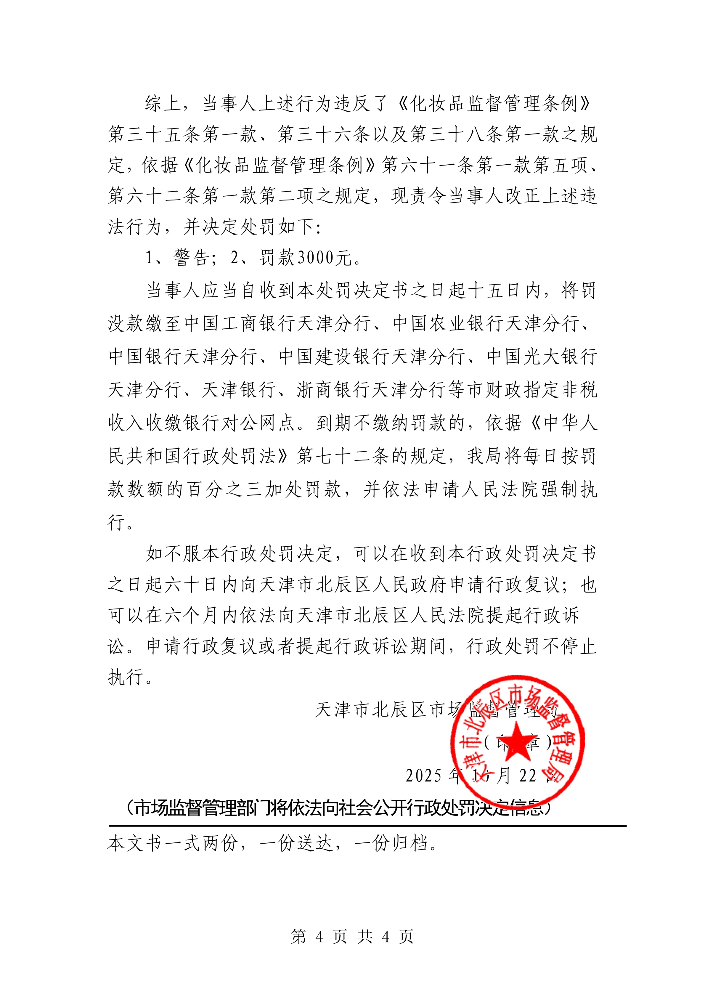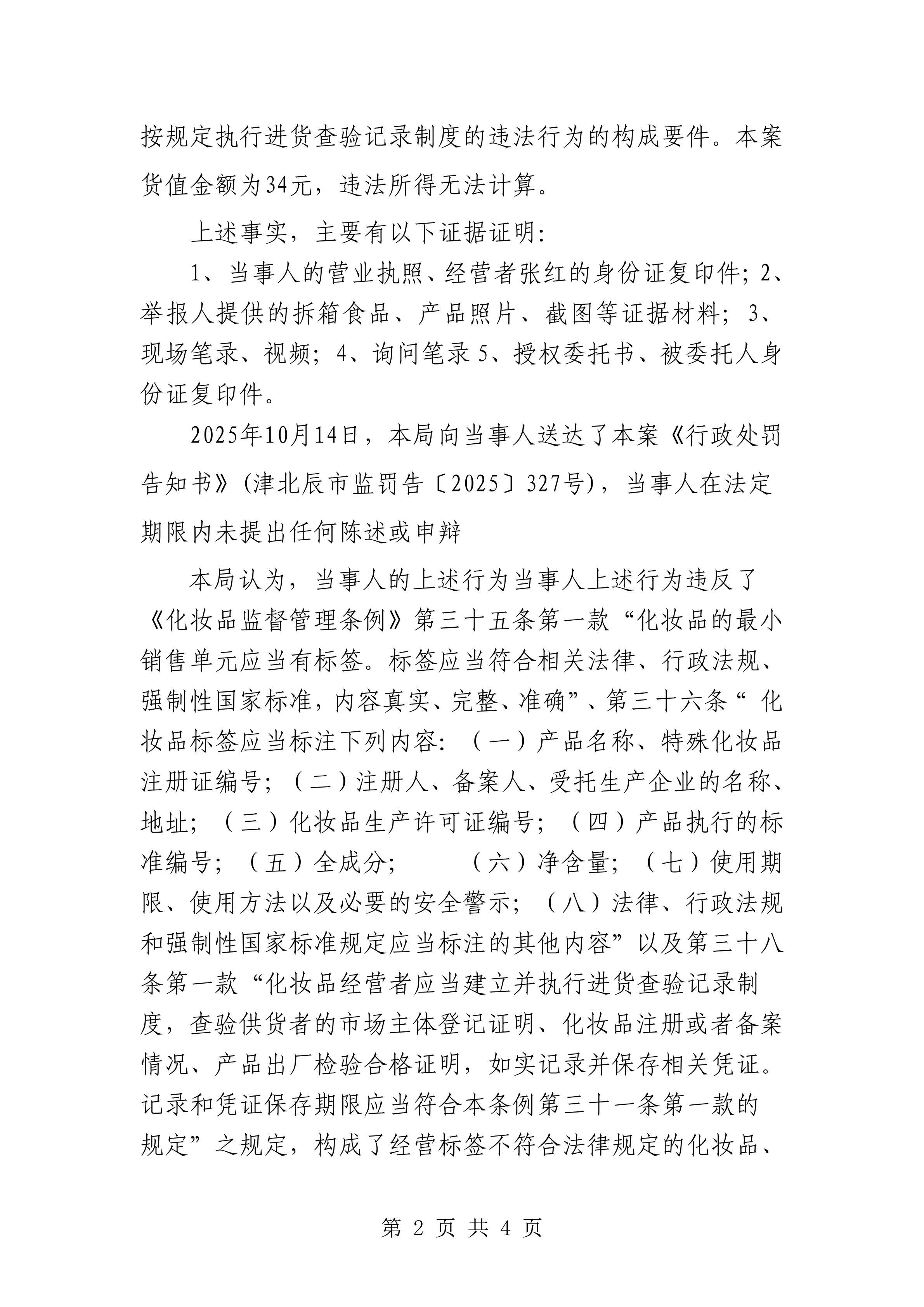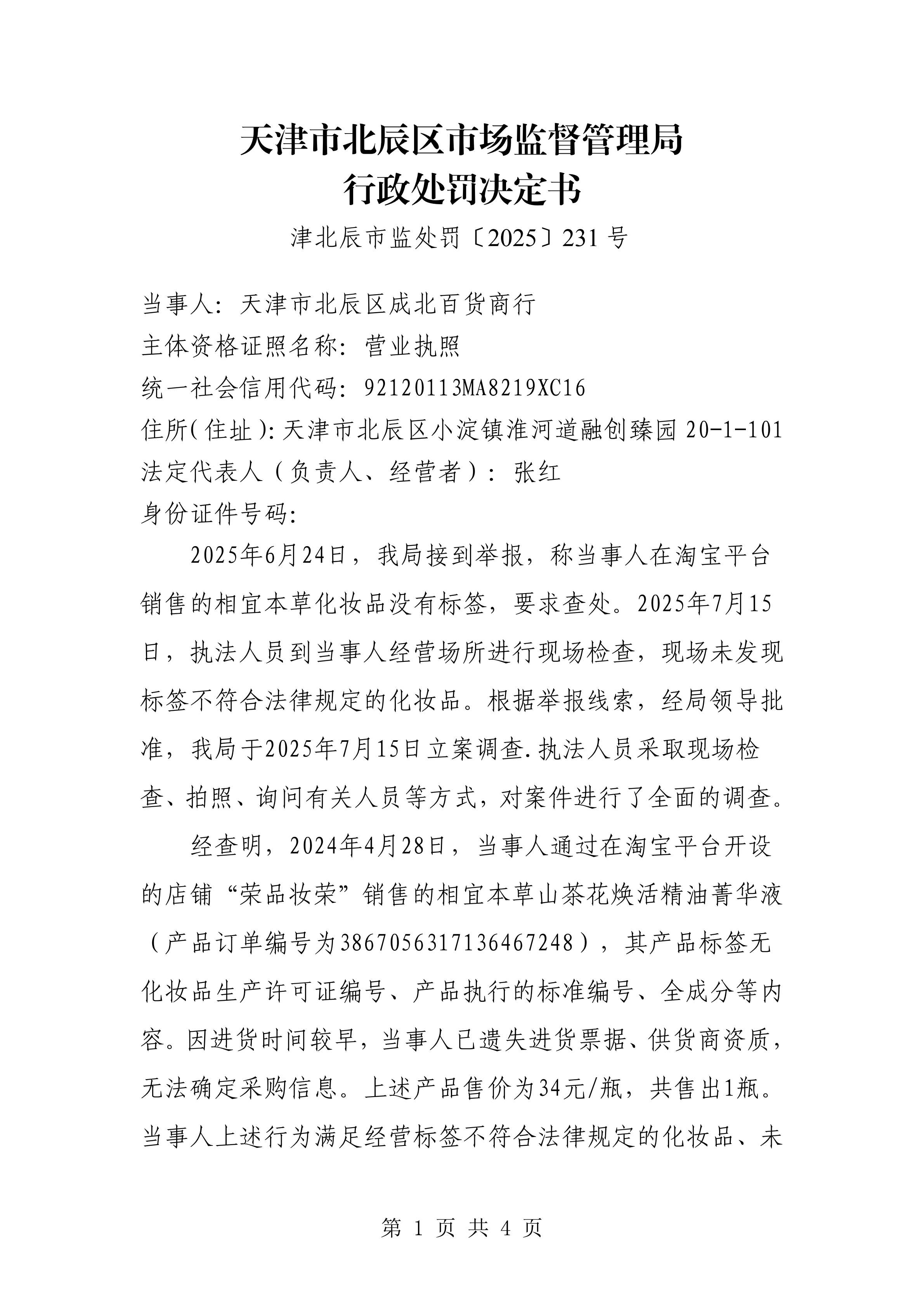 津北辰市监处罚〔2025〕231号-天津市北辰区成北百货商行经营标签不符合法律规定的化妆品、未按规定执行进货查验记录制度的违法行为案