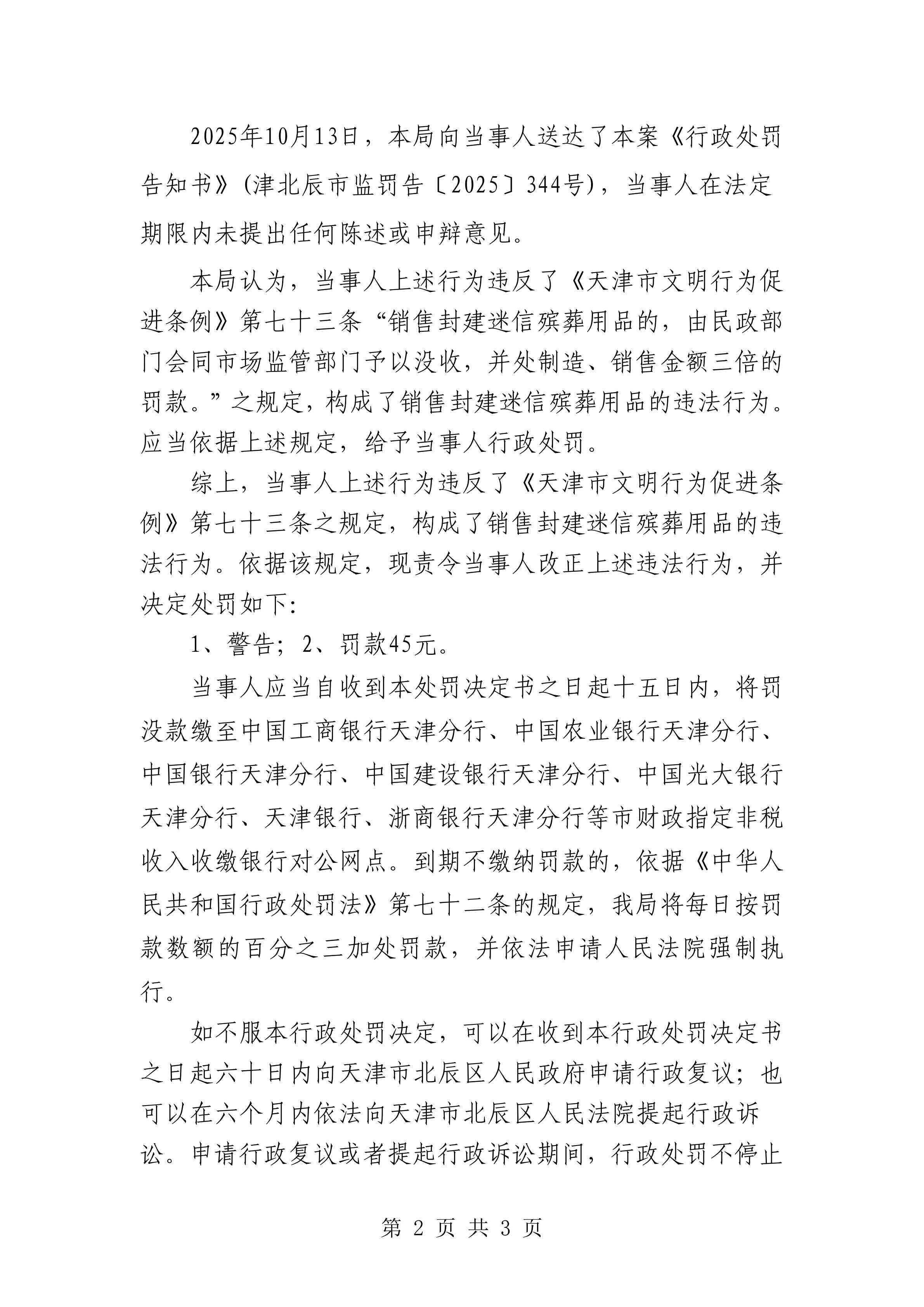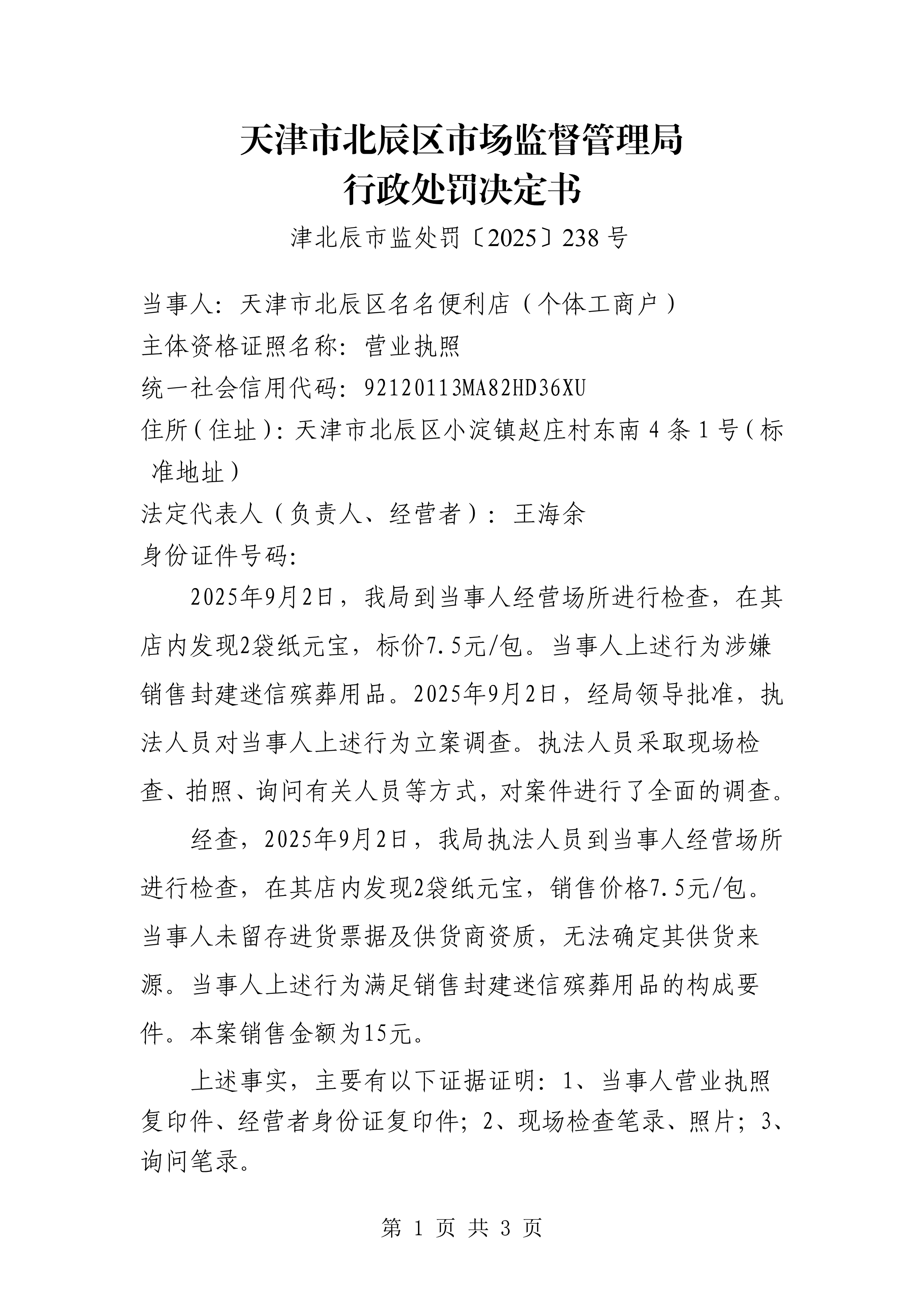 津北辰市监处罚〔2025〕238号-天津市北辰区名名便利店销售封建迷信殡葬用品案