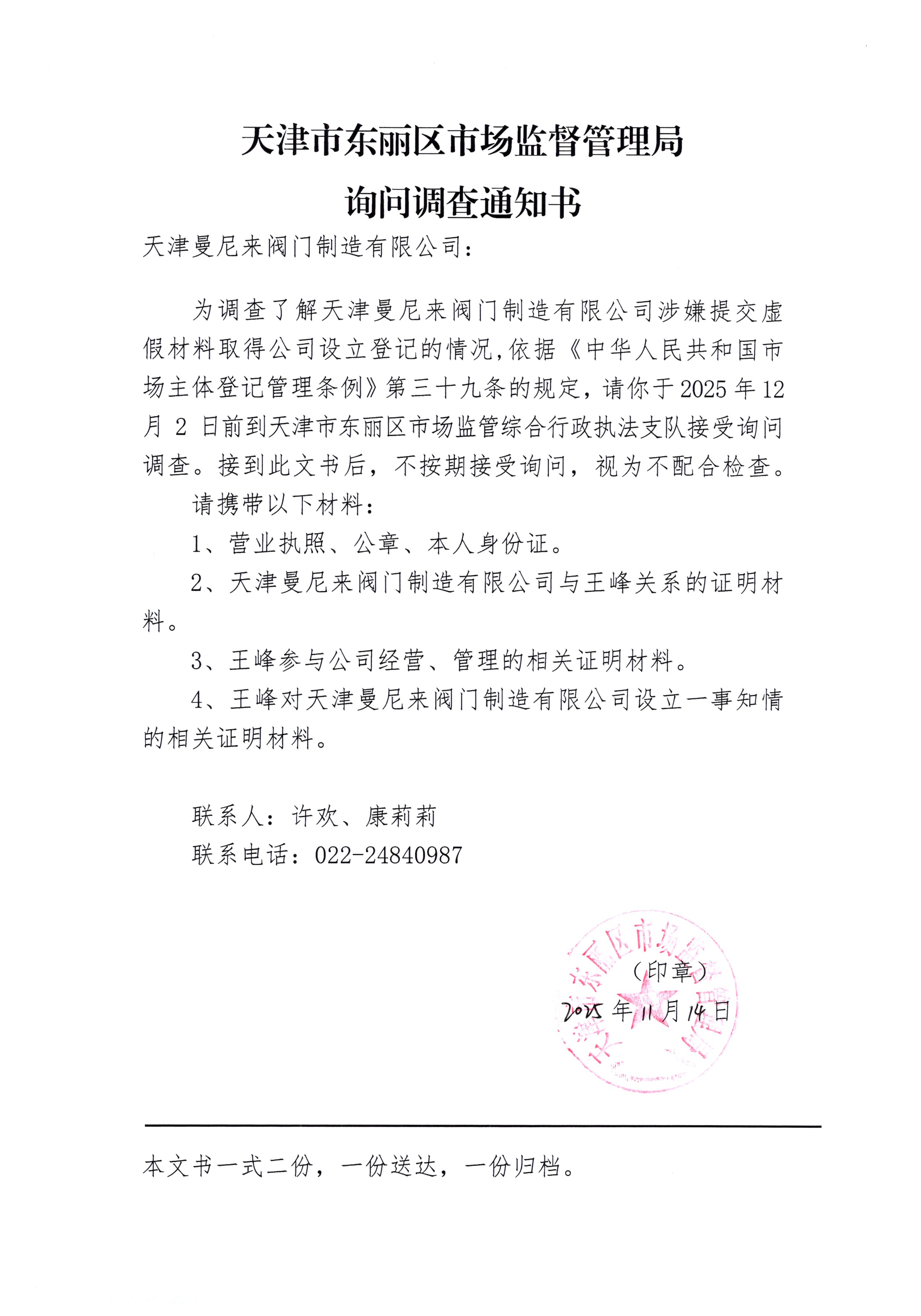 询问调查通知书-天津曼尼来阀门制造有限公司