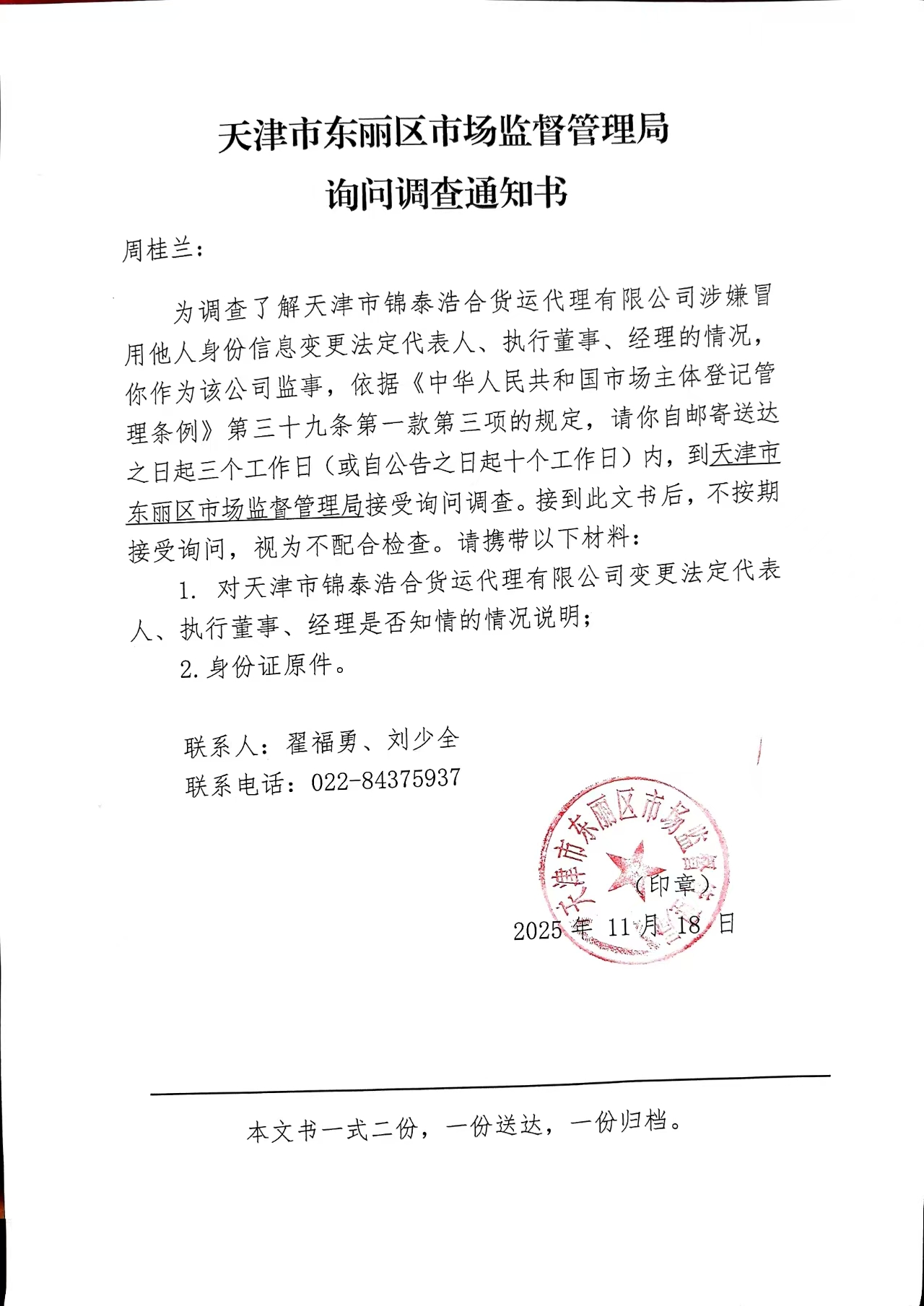询问调查通知书-周桂兰(天津市锦泰浩合货运代理有限公司)