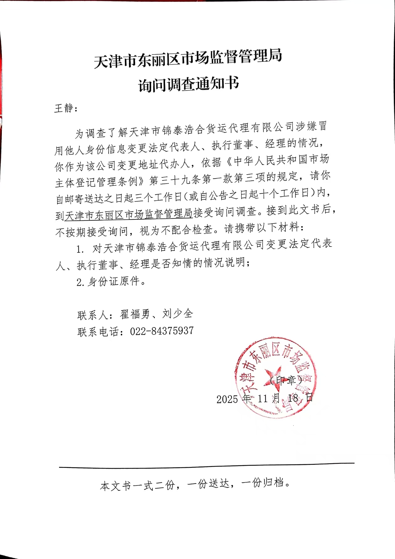 询问调查通知书-王静(天津市锦泰浩合货运代理有限公司)