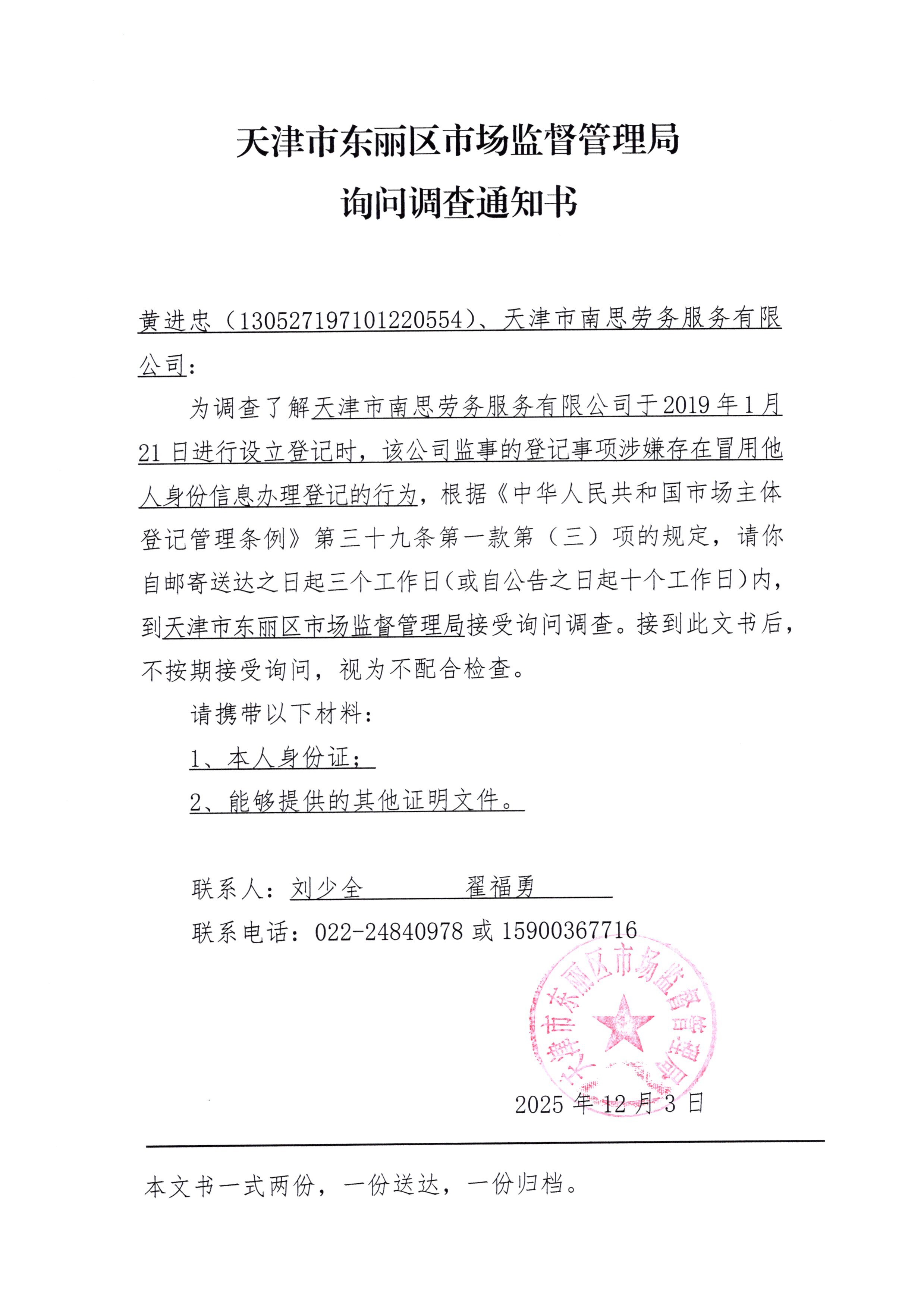 《询问调查通知书》——黄进忠(天津市南思劳务服务有限公司)