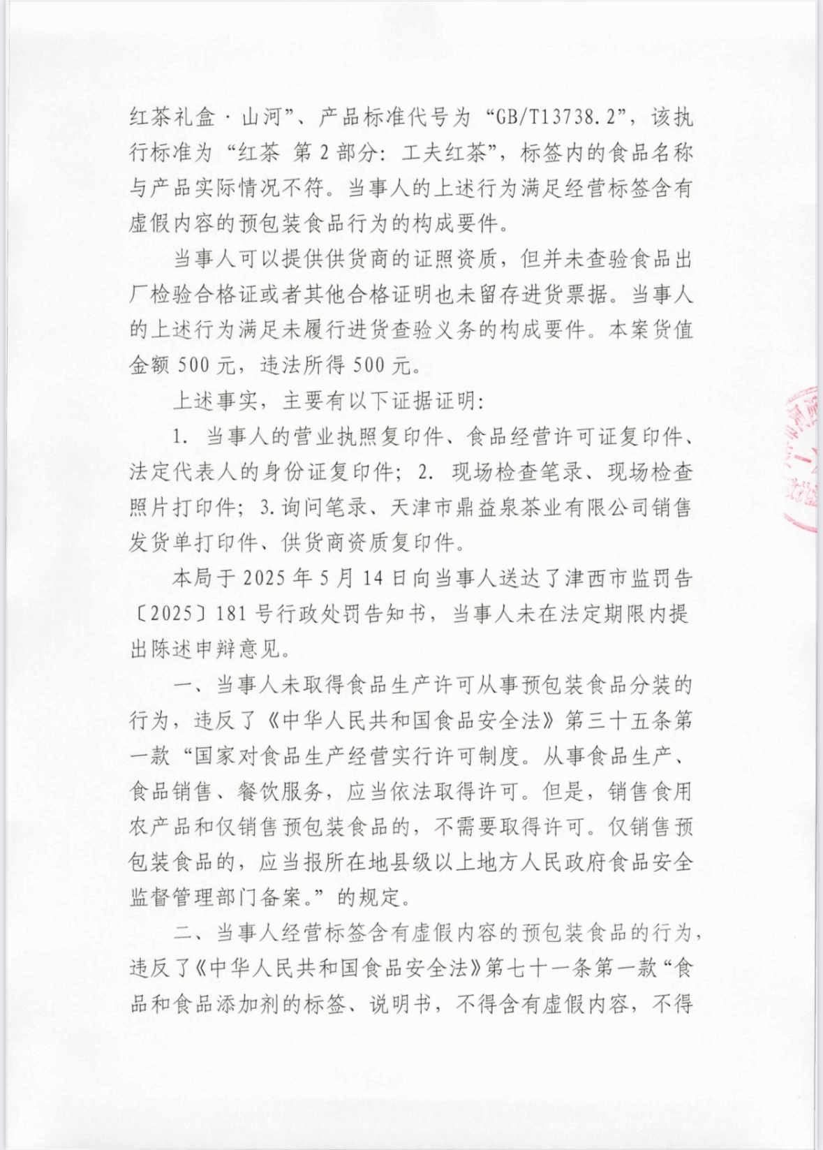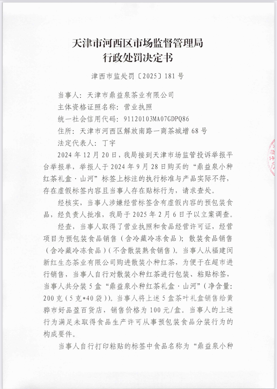 天津市河西区市场监督管理局行政处罚决定书-天津市鼎益泉茶叶有限公司