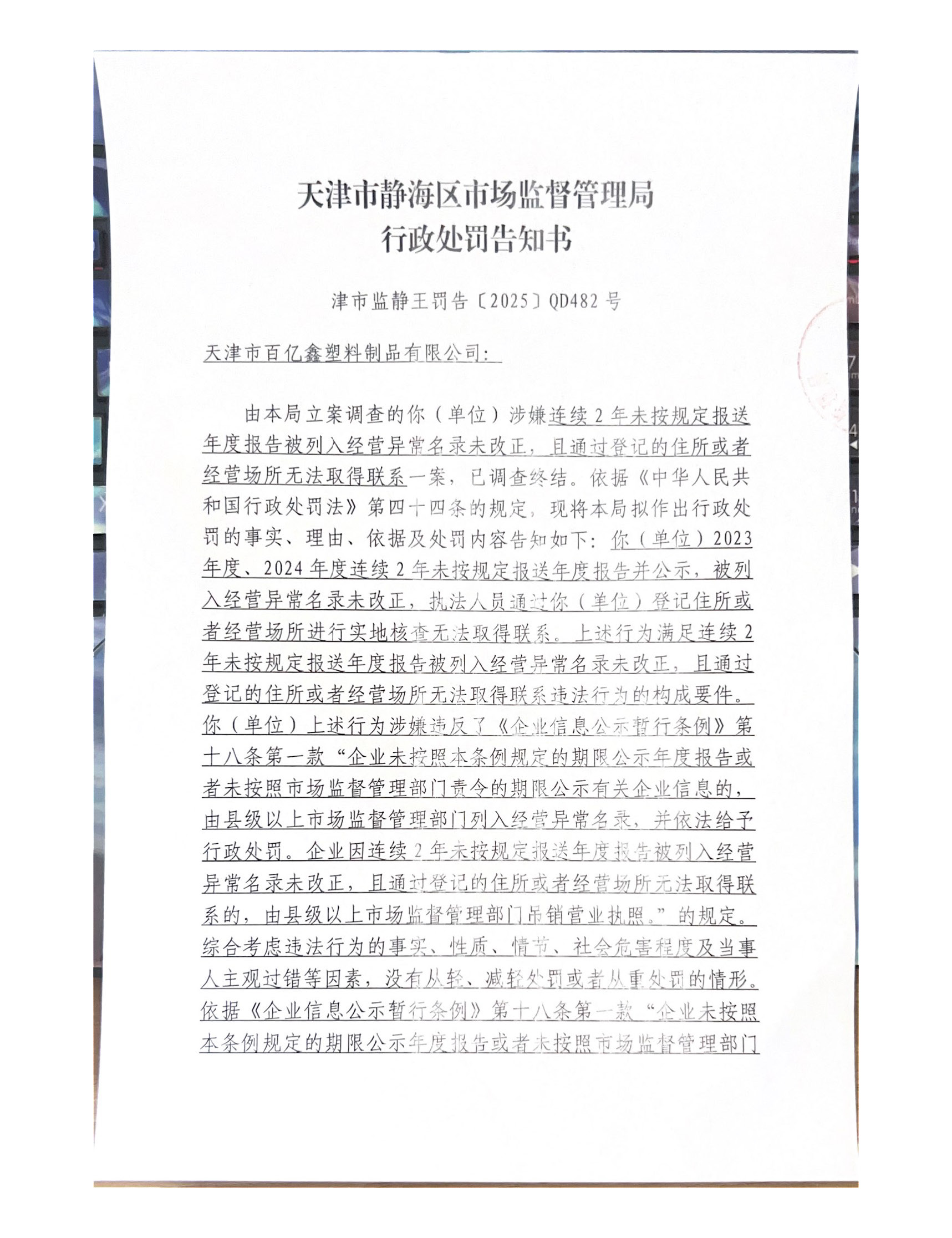关于天津市百亿鑫塑料制品有限公司的行政处罚告知书公告