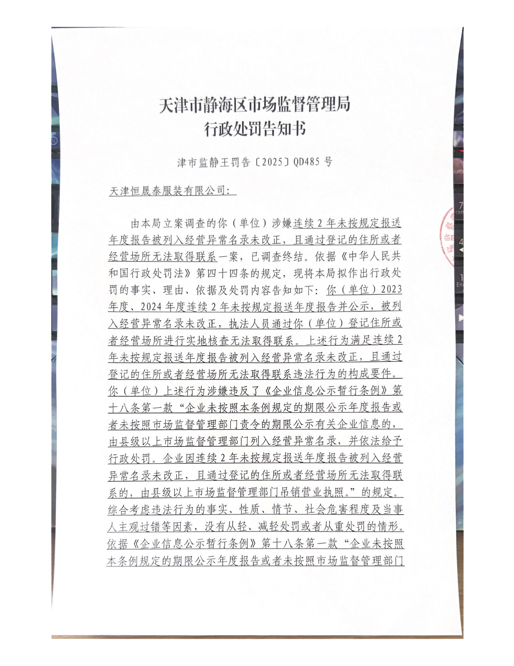 关于天津恒晟泰服装有限公司的行政处罚告知书公告