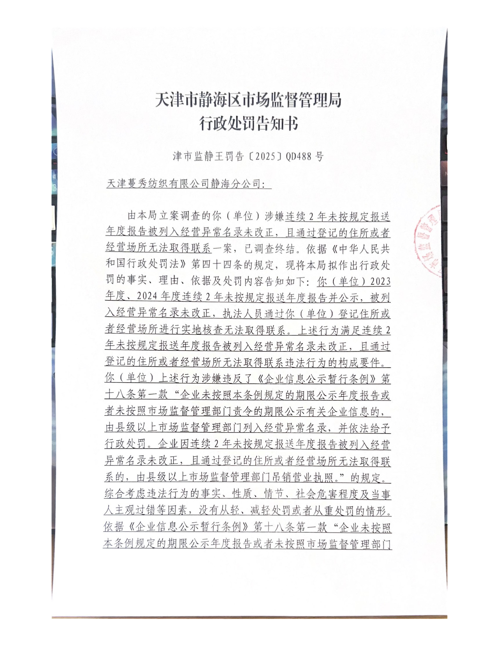 关于天津蔓秀纺织有限公司静海分公司的行政处罚告知书公告