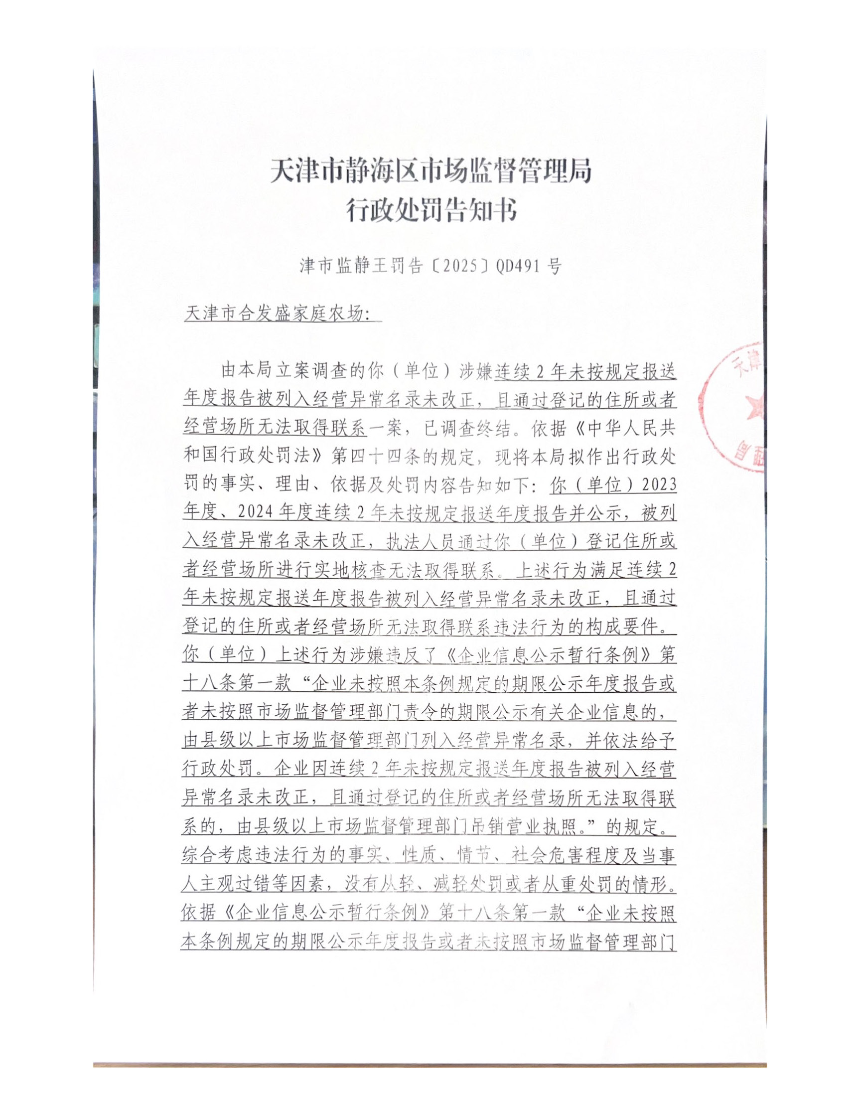 关于天津市合发盛家庭农场的行政处罚告知书公告