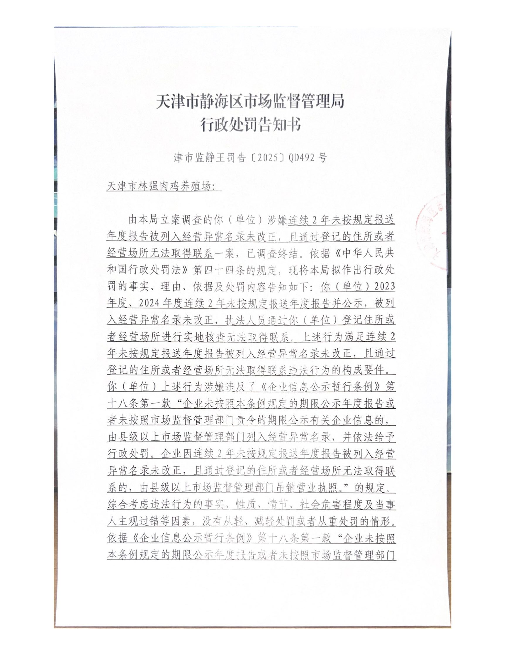 关于天津市林强肉鸡养殖场的行政处罚告知书公告
