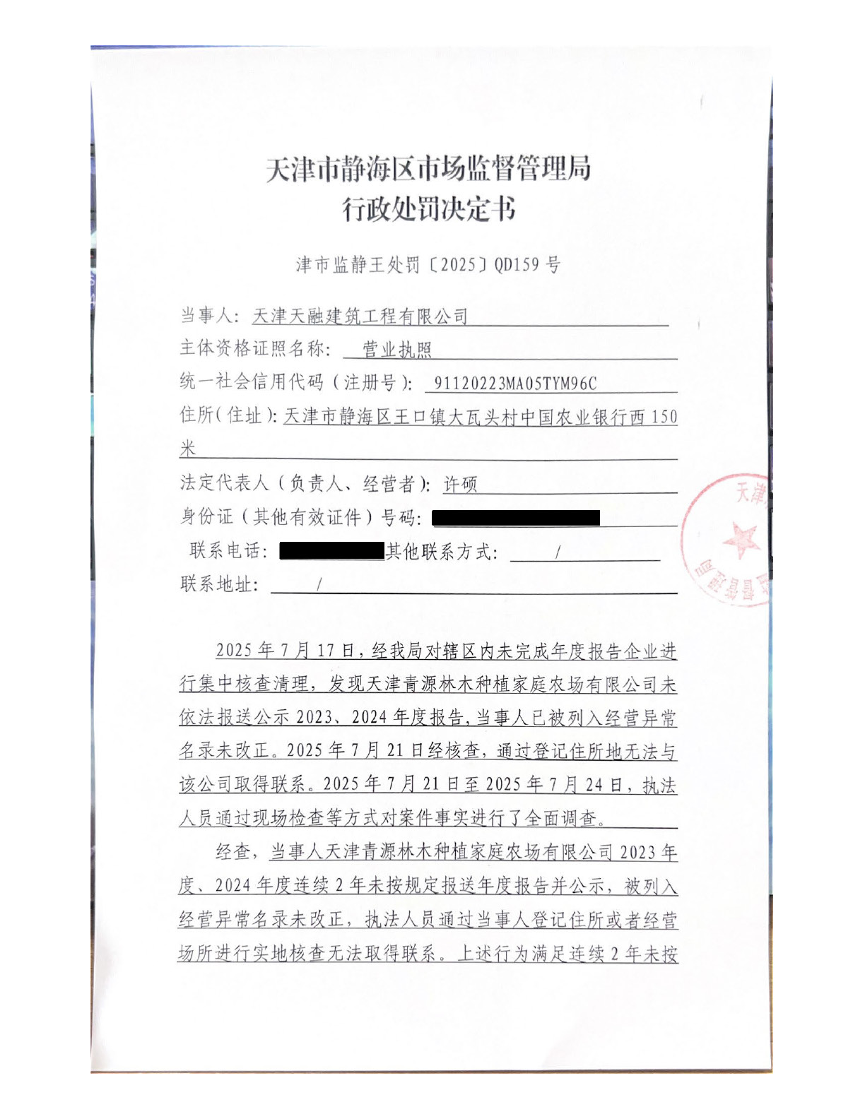 关于天津天融建筑工程有限公司的吊销行政处罚决定书公告