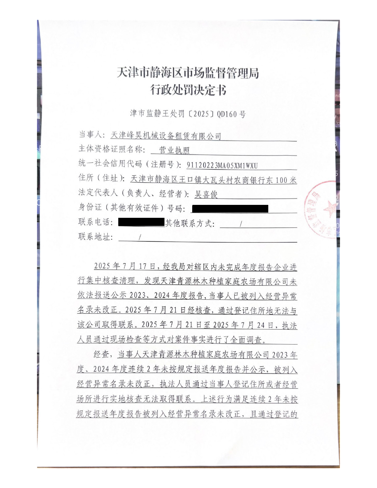 关于天津峰昊机械设备租赁有限公司的吊销行政处罚决定书公告
