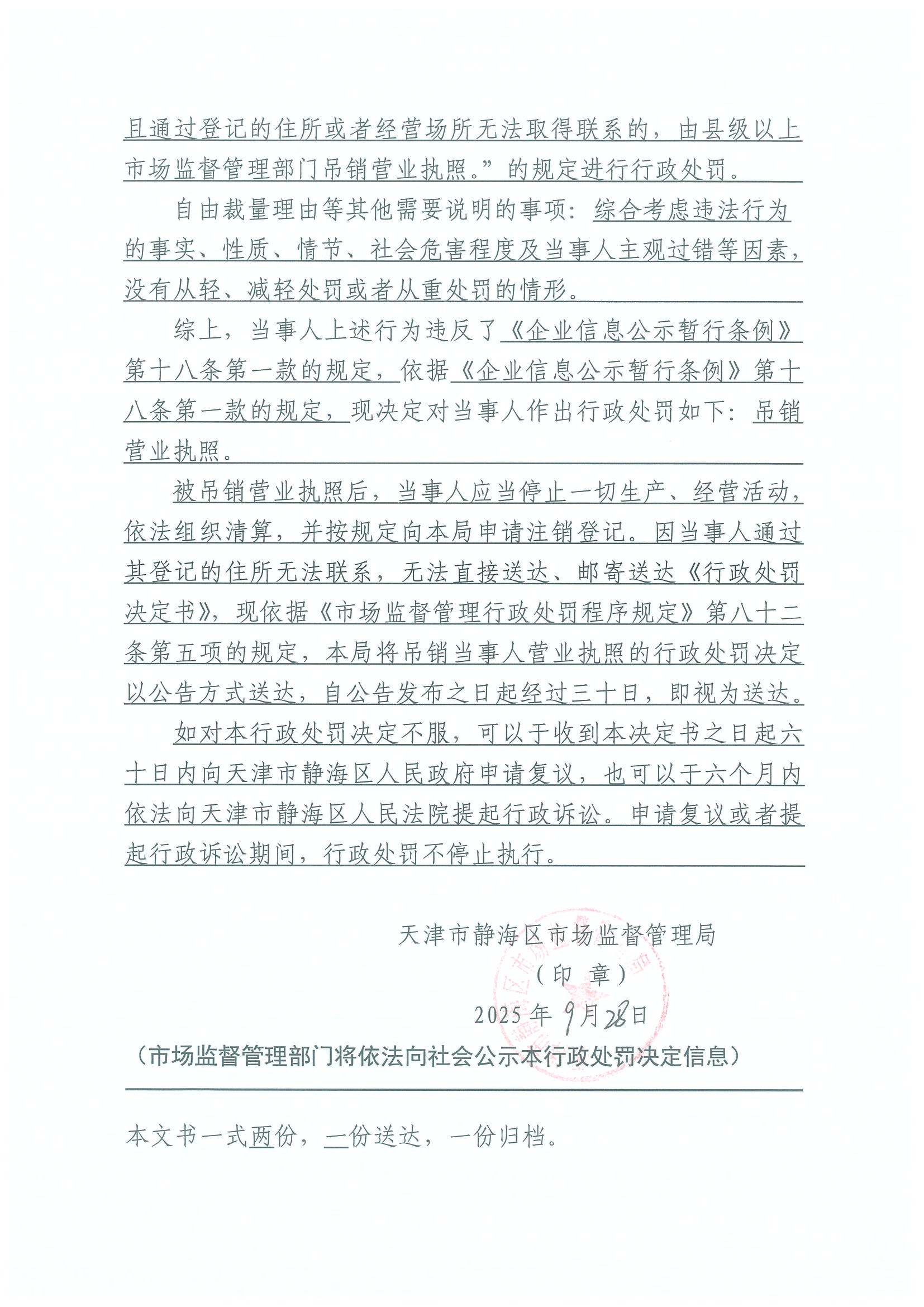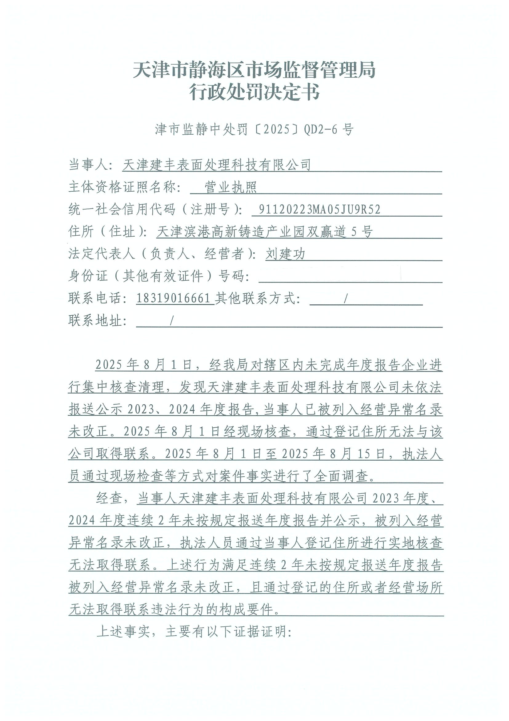 关于天津建丰表面处理科技有限公司吊销决定公告