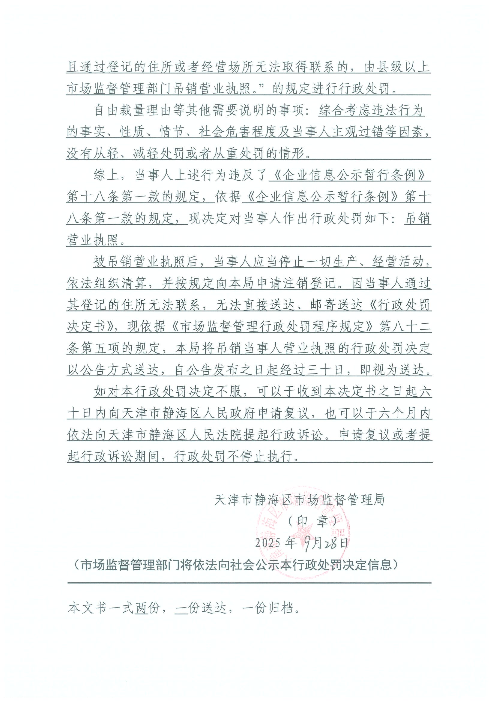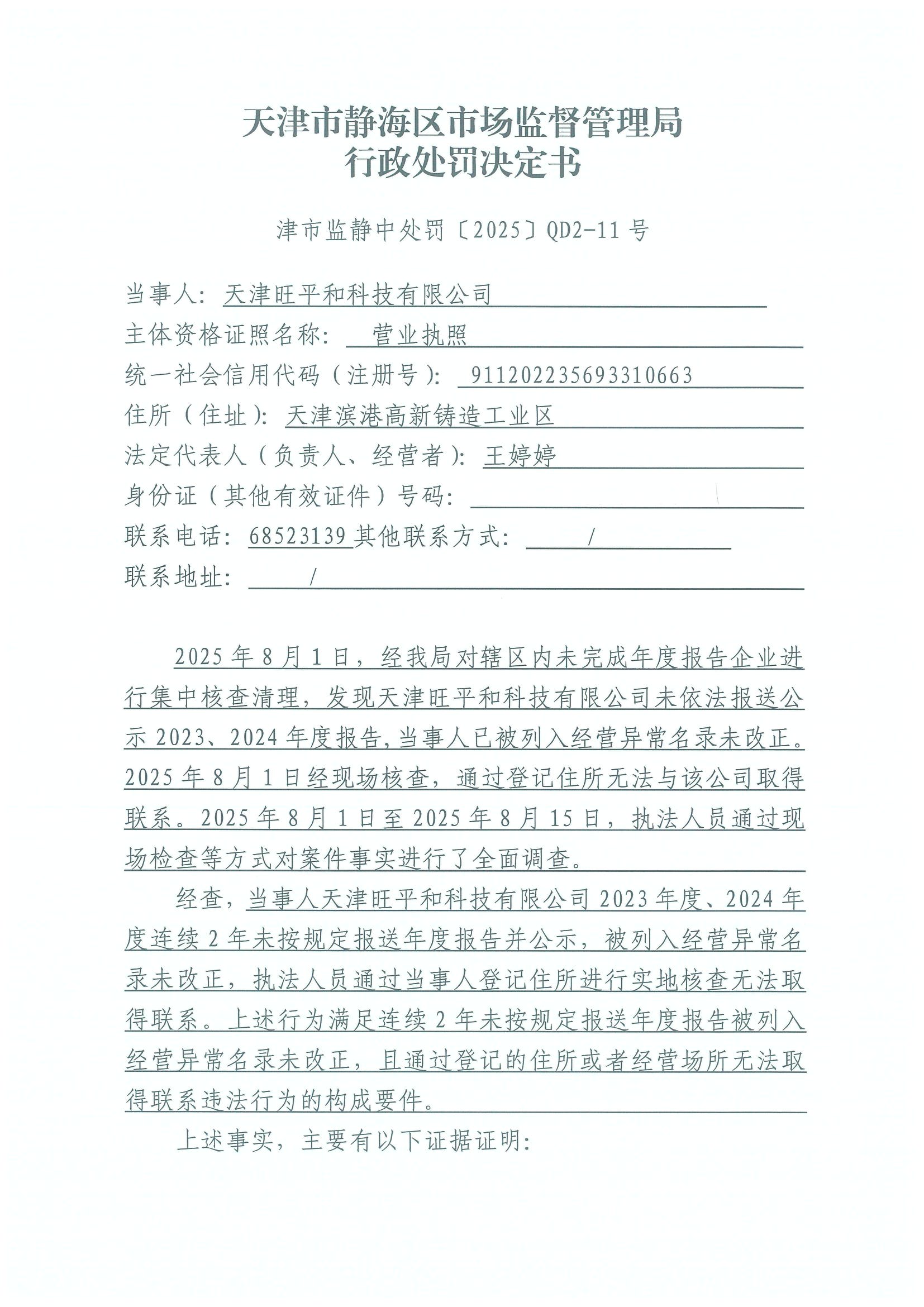 关于天津旺平和科技有限公司吊销决定公告