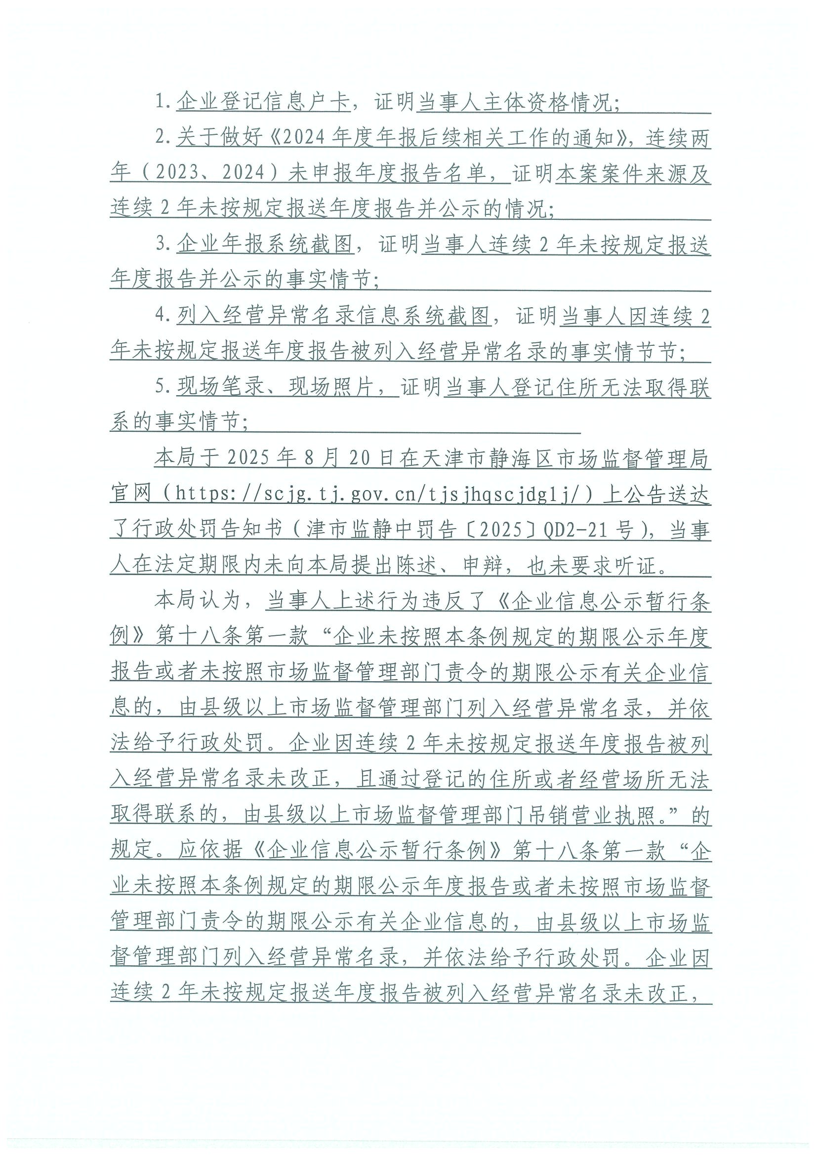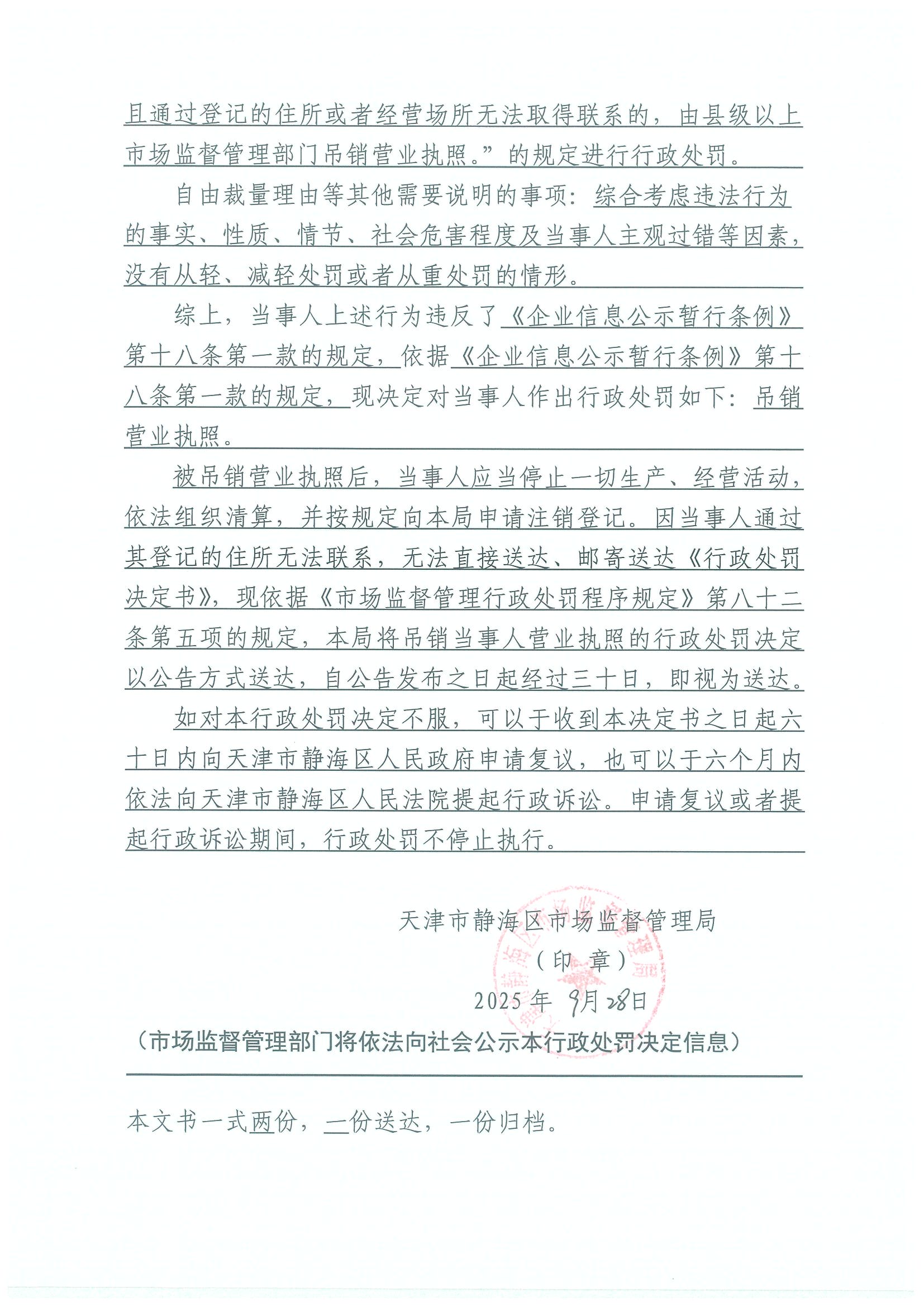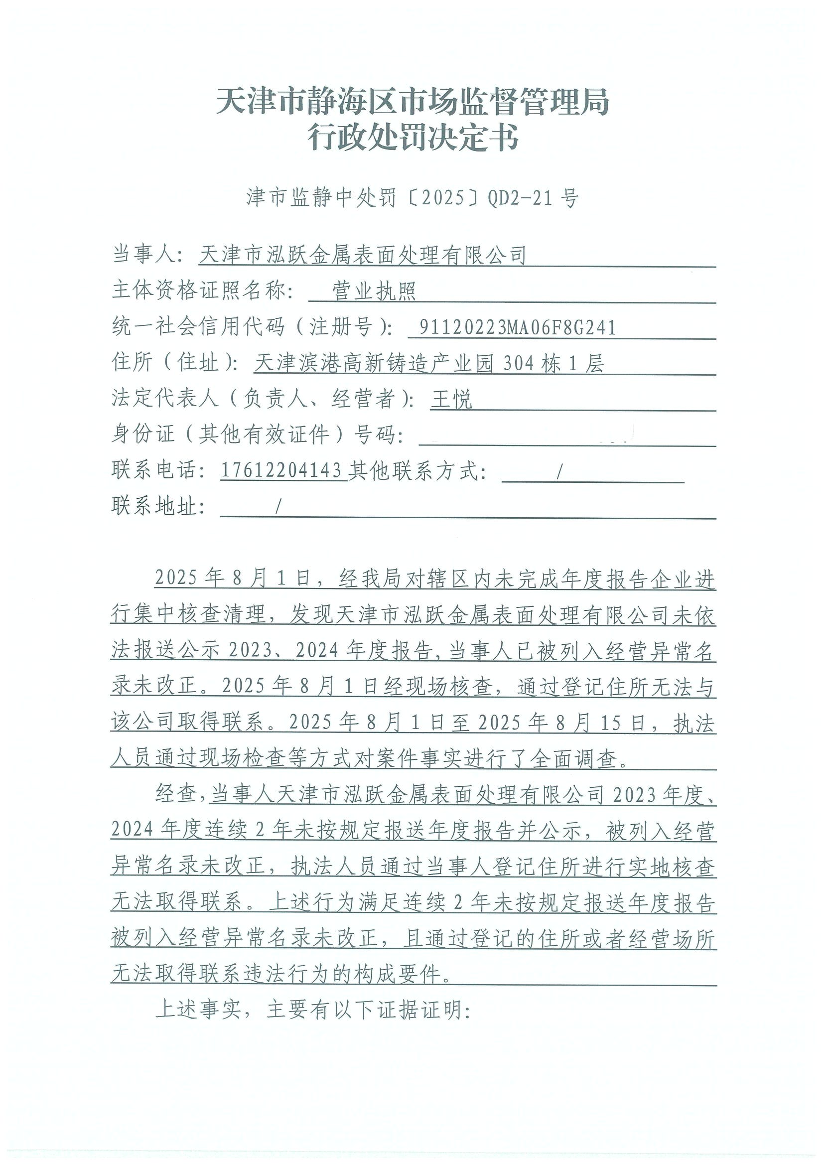 关于天津市泓跃金属表面处理有限公司吊销决定公告