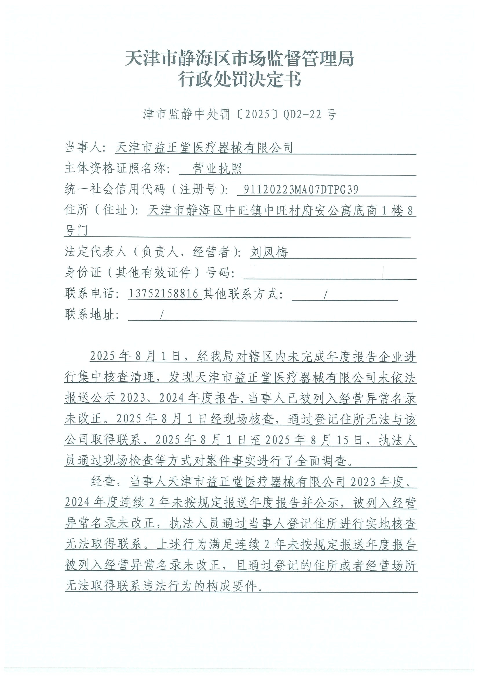 关于天津市益正堂医疗器械有限公司吊销决定公告