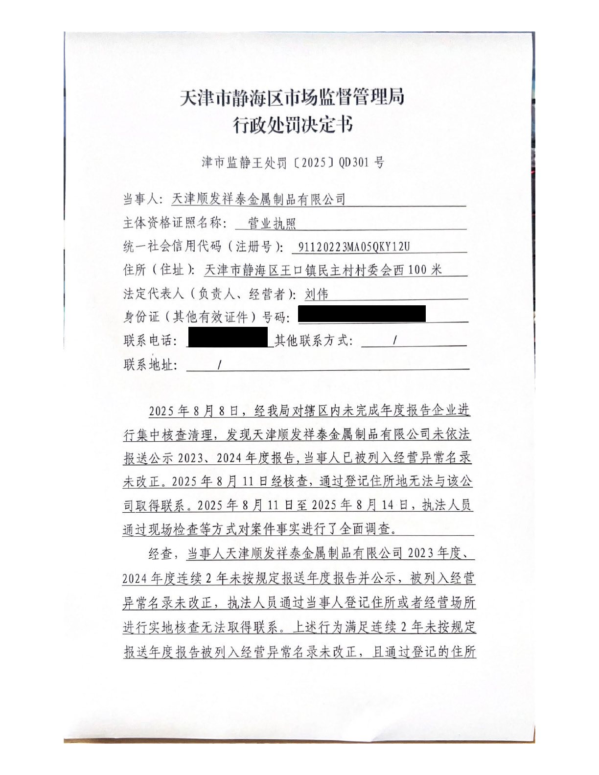 关于天津顺发祥泰金属制品有限公司的吊销行政处罚决定书公告