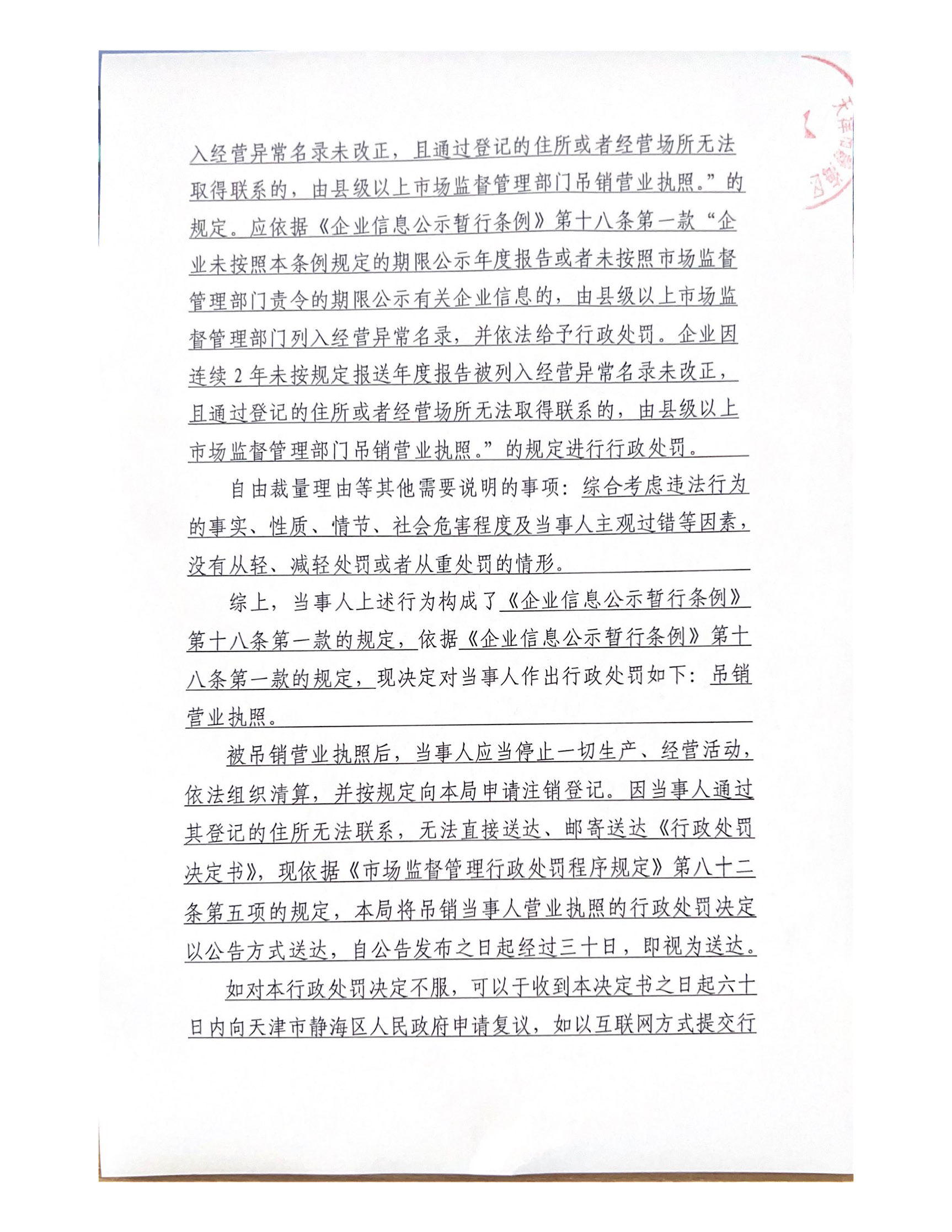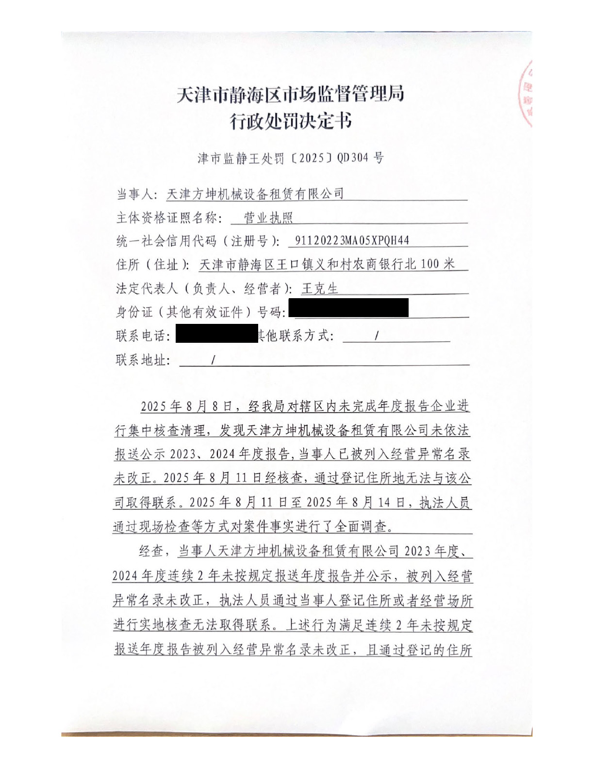 关于天津方坤机械设备租赁有限公司的吊销行政处罚决定书公告