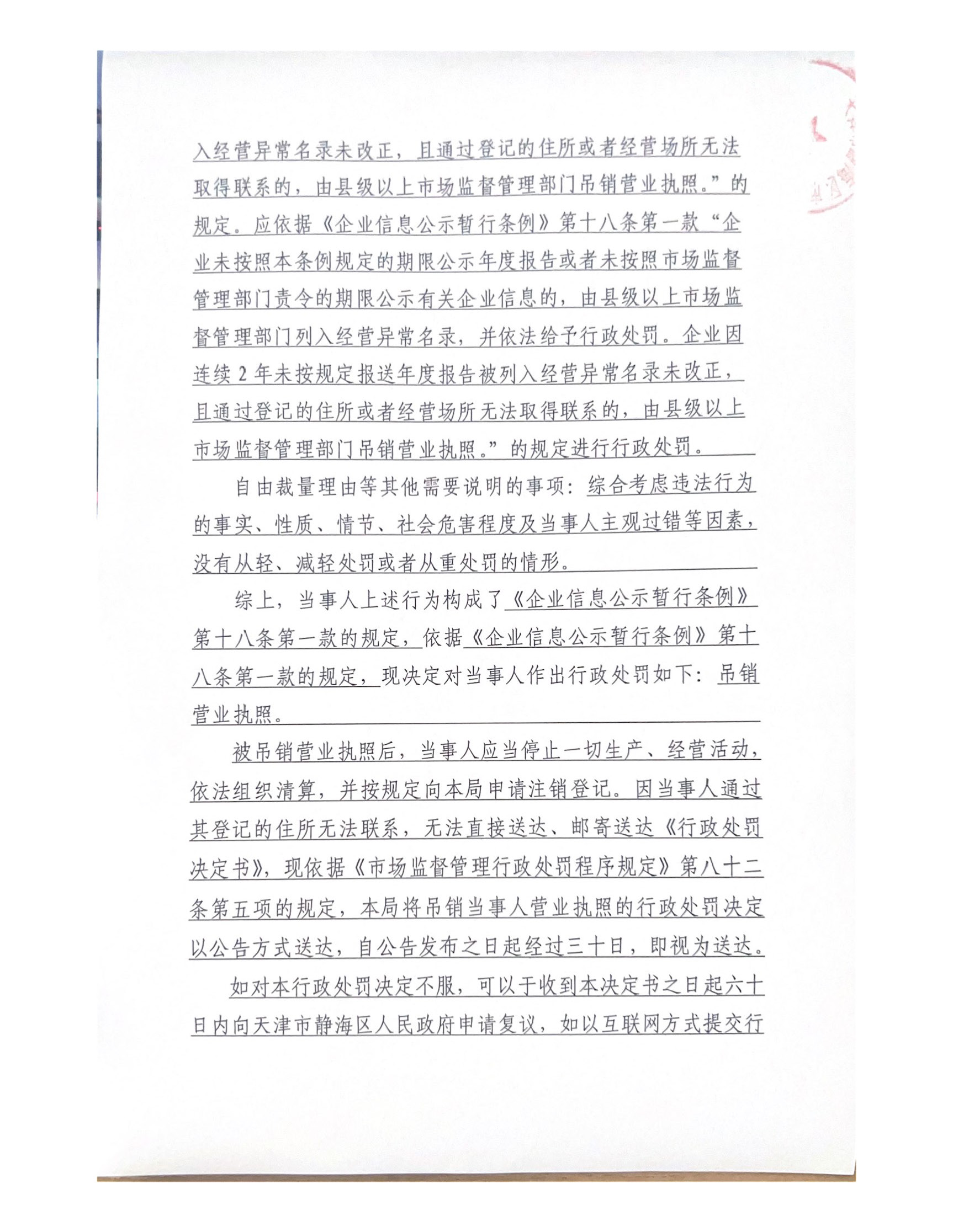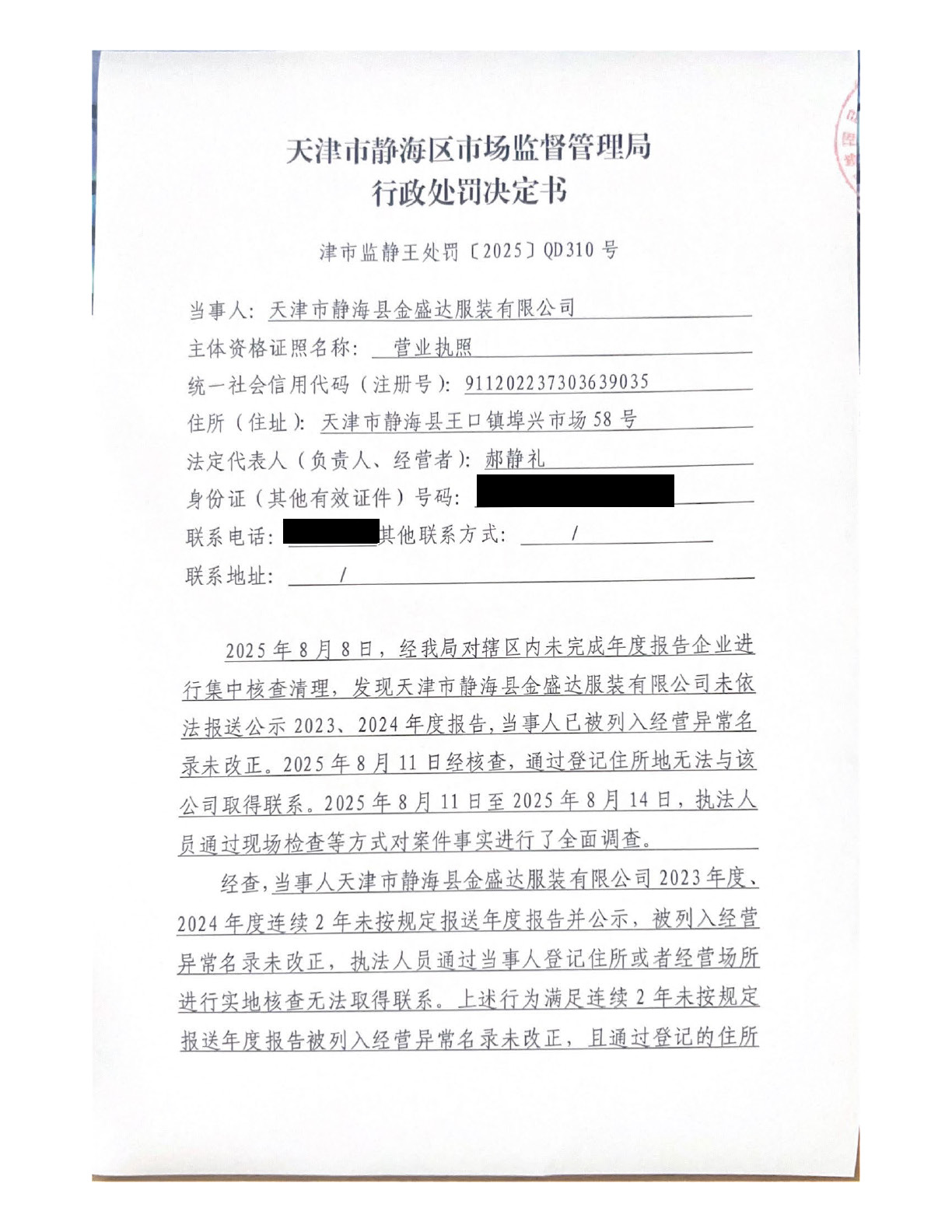 关于天津市静海县金盛达服装有限公司的吊销行政处罚决定书公告