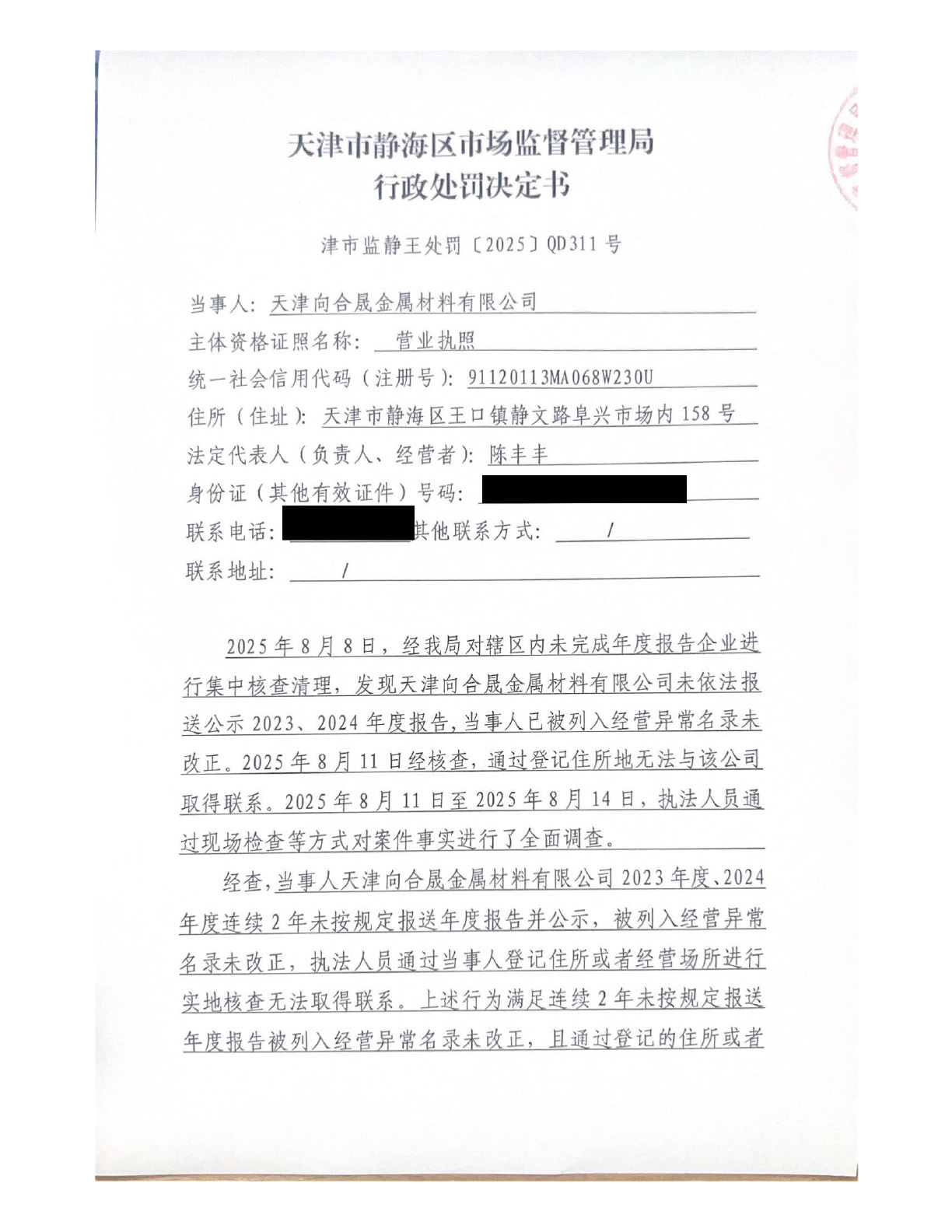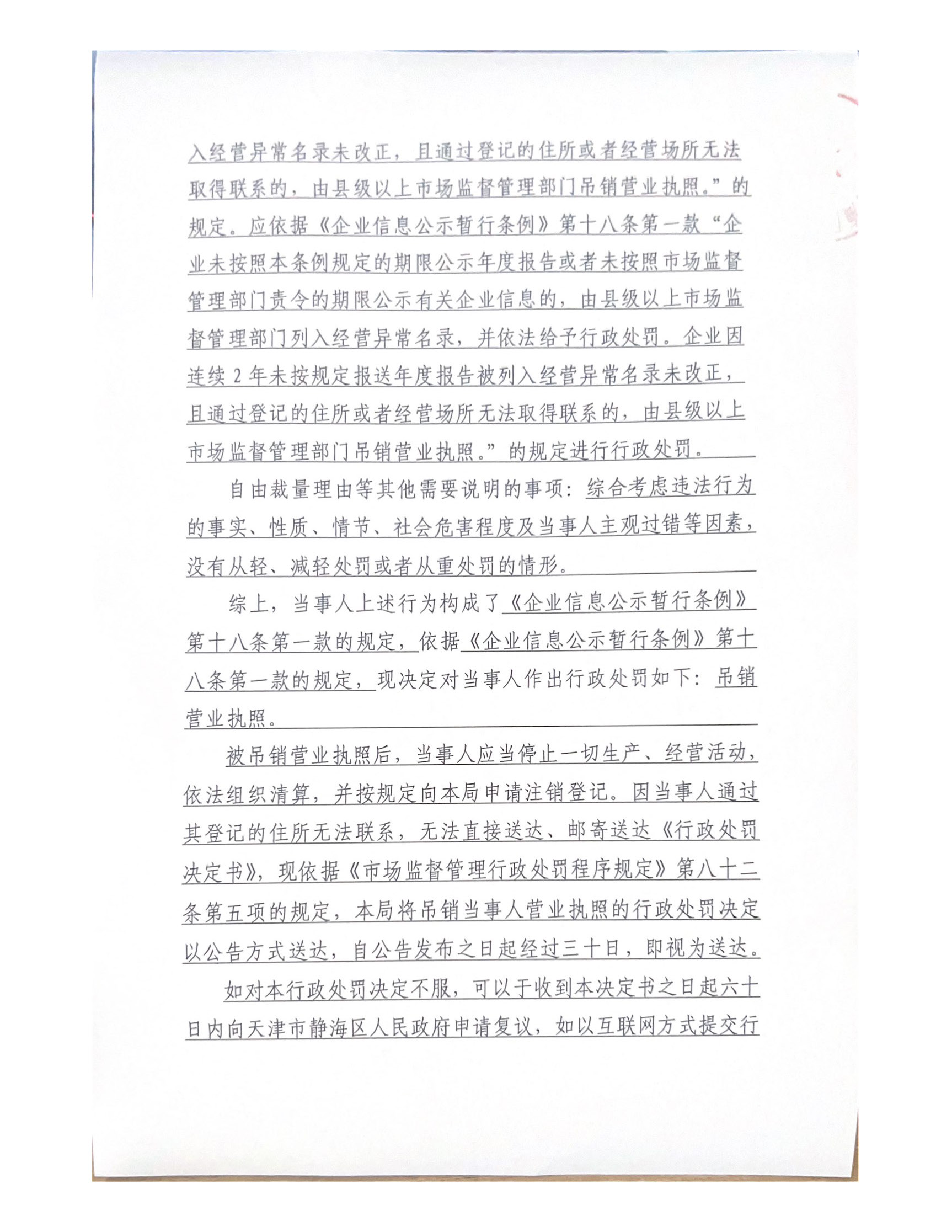 关于天津向合晟金属材料有限公司的吊销行政处罚决定书公告