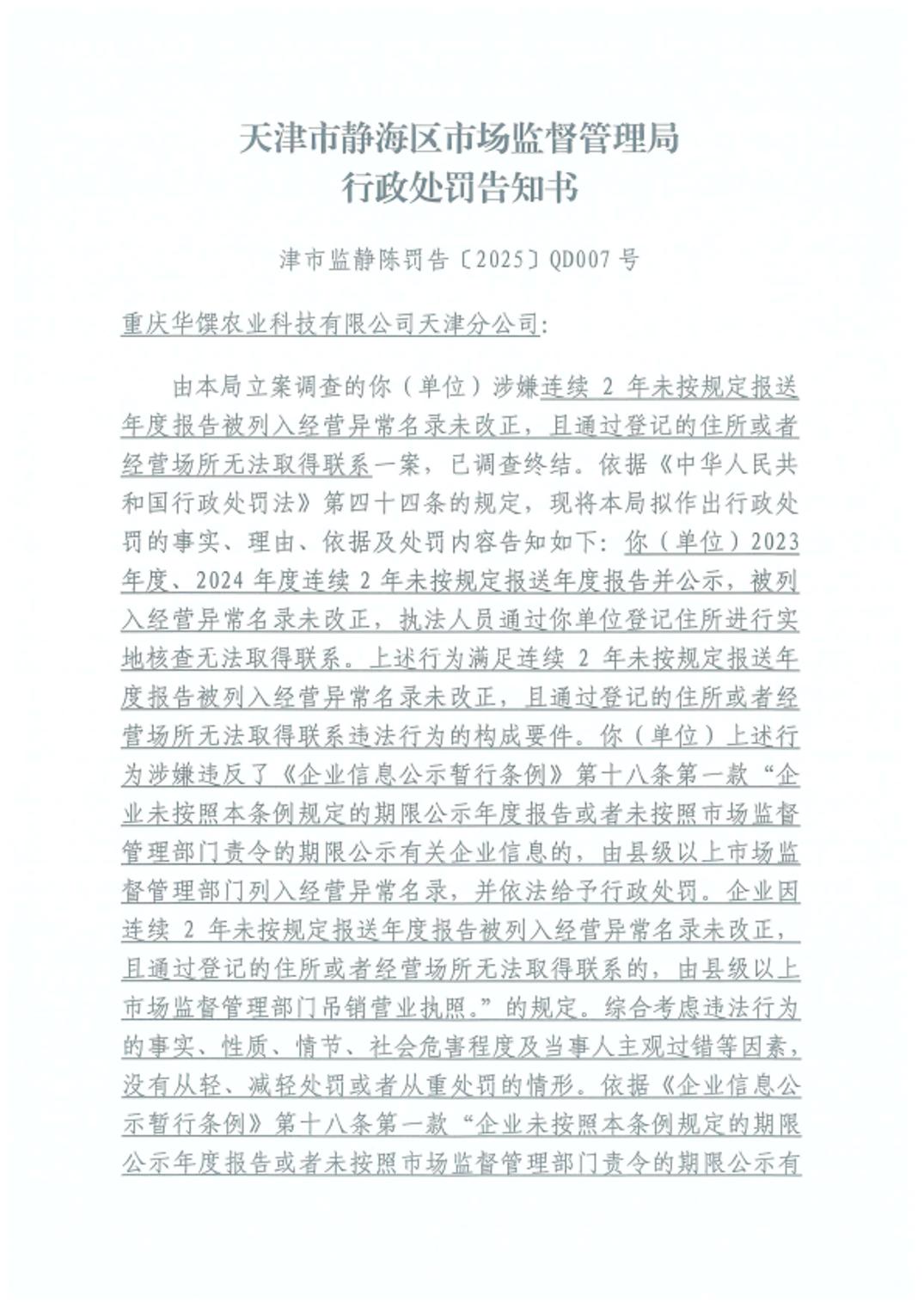 关于重庆华馔农业科技有限公司天津分公司的行政处罚告知书公告