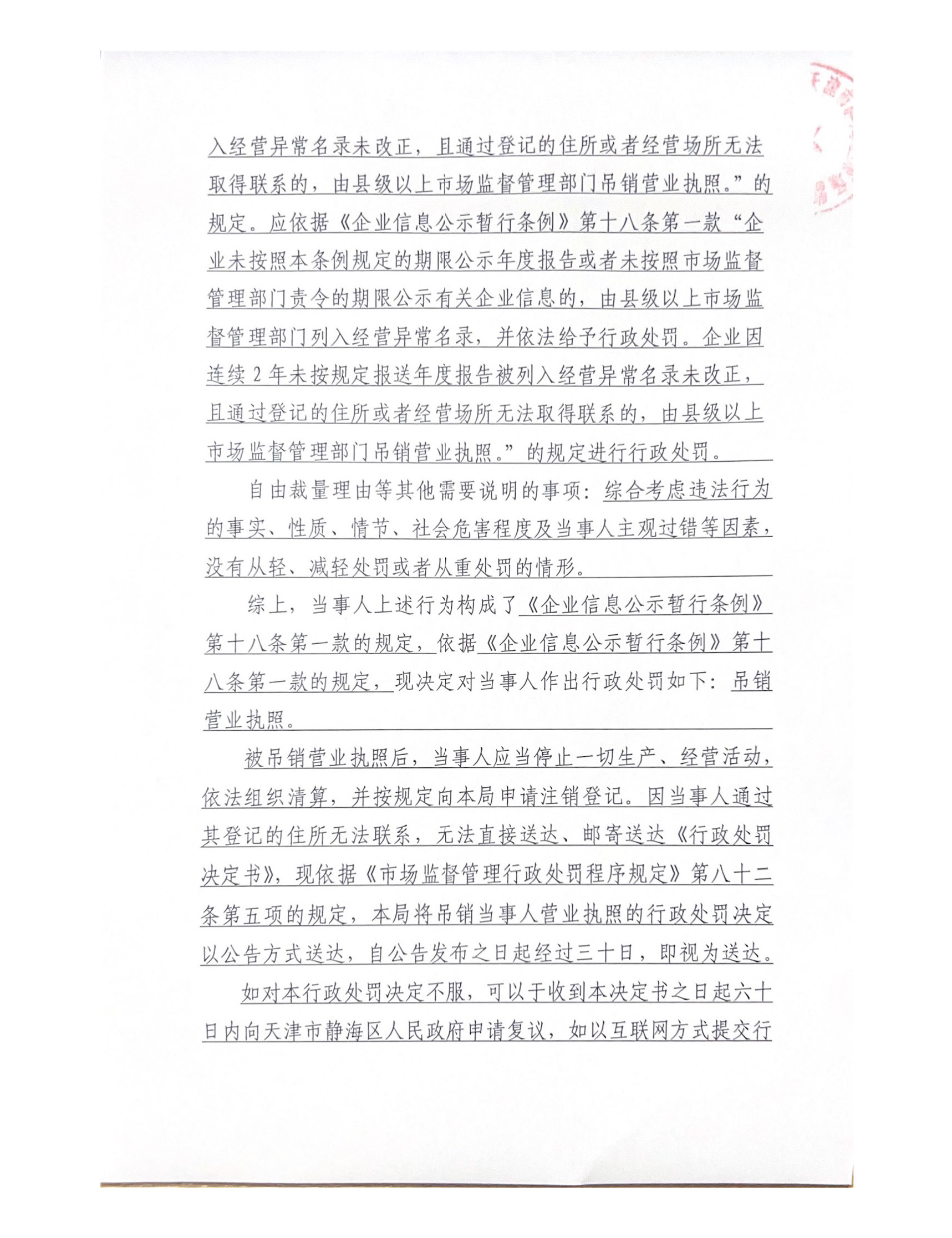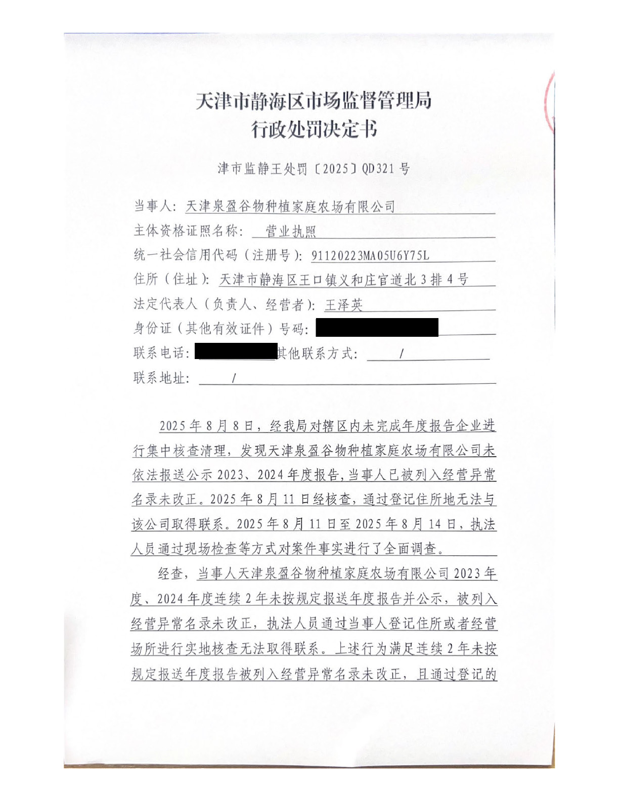 关于天津泉盈谷物种植家庭农场有限公司的吊销行政处罚决定书公告