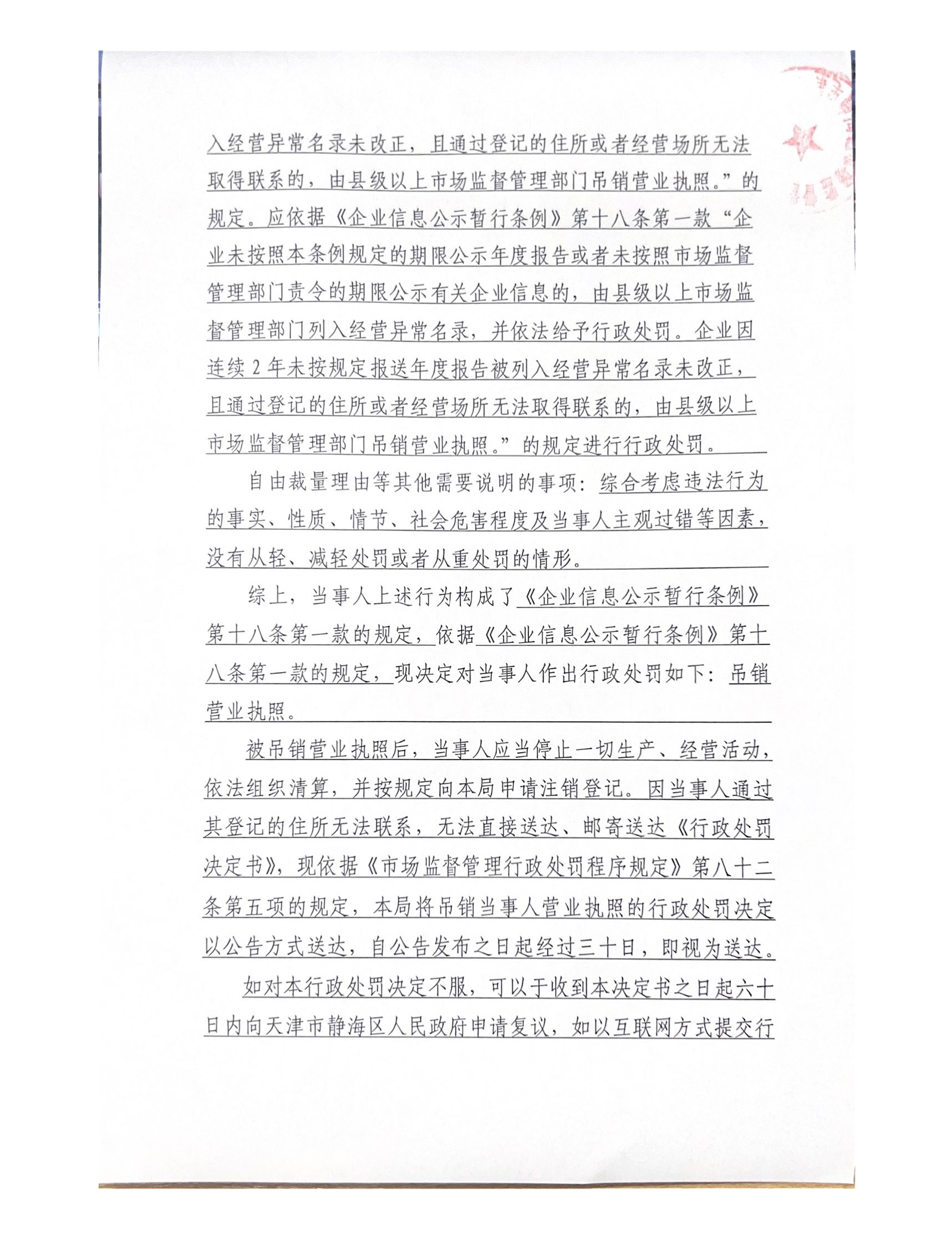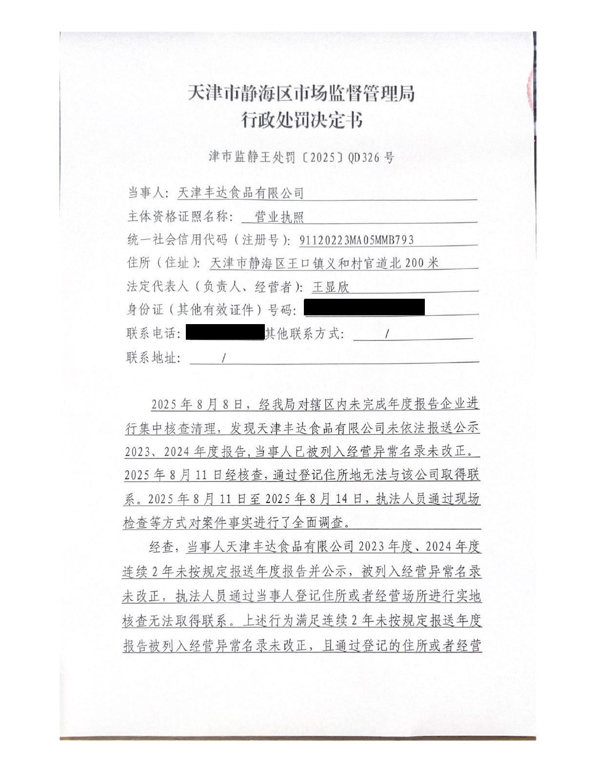 关于天津丰达食品有限公司的吊销行政处罚决定书公告