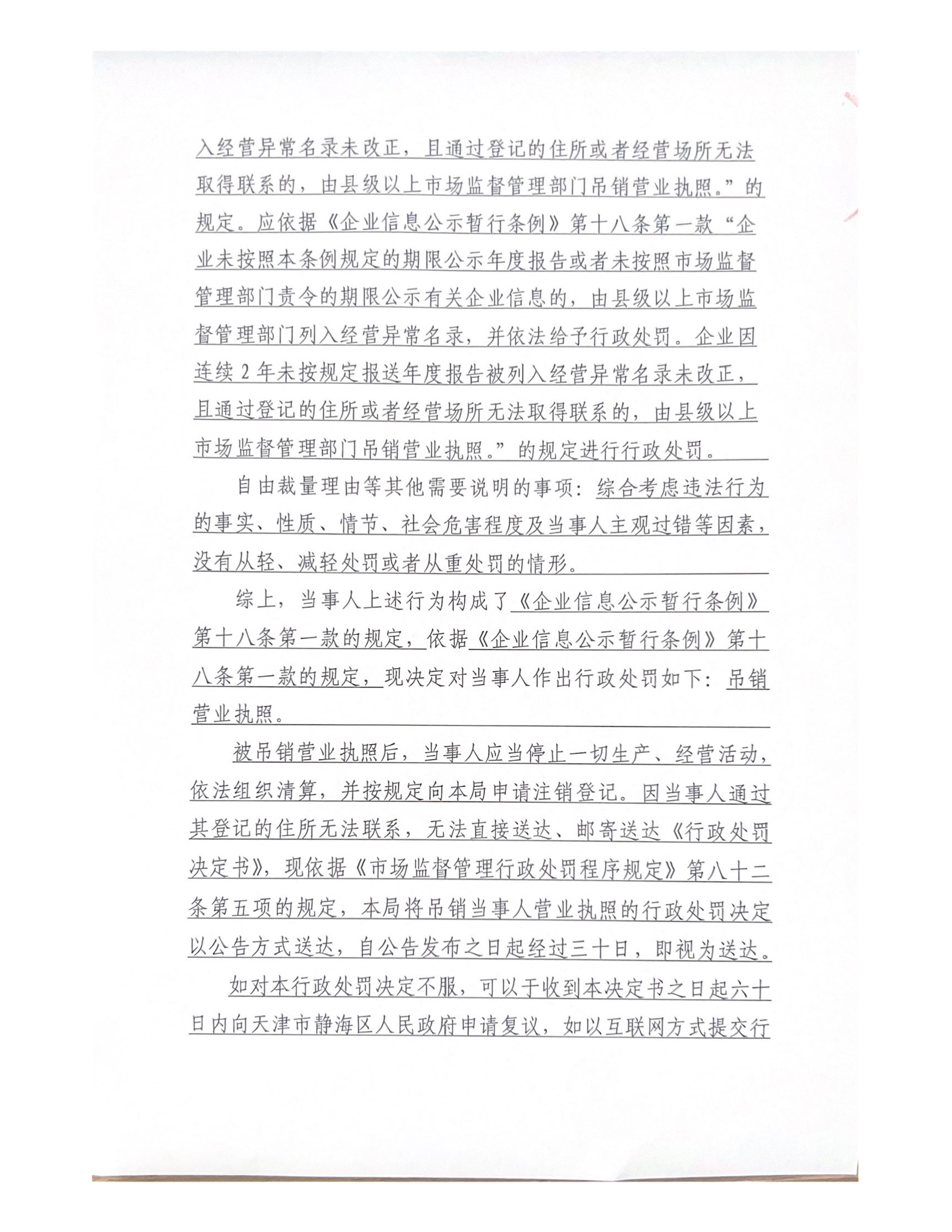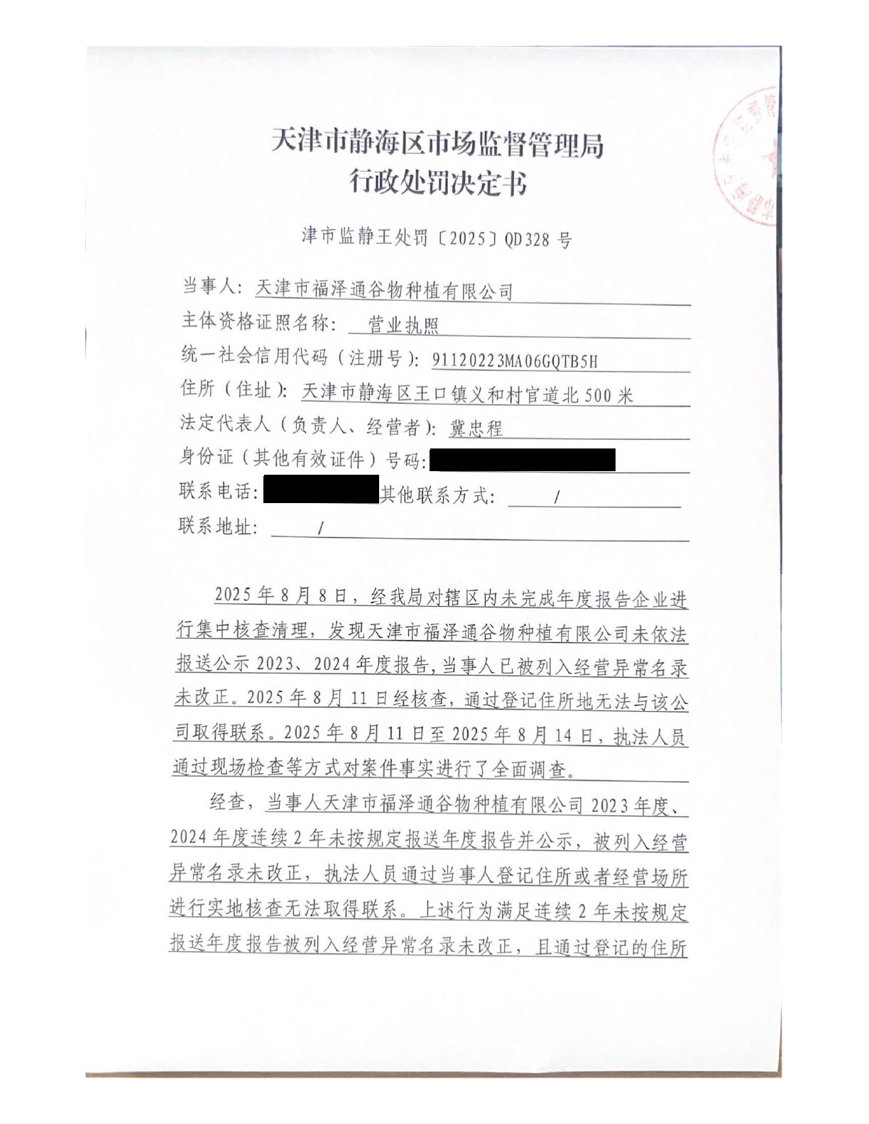 关于天津市福泽通谷物种植有限公司的吊销行政处罚决定书公告