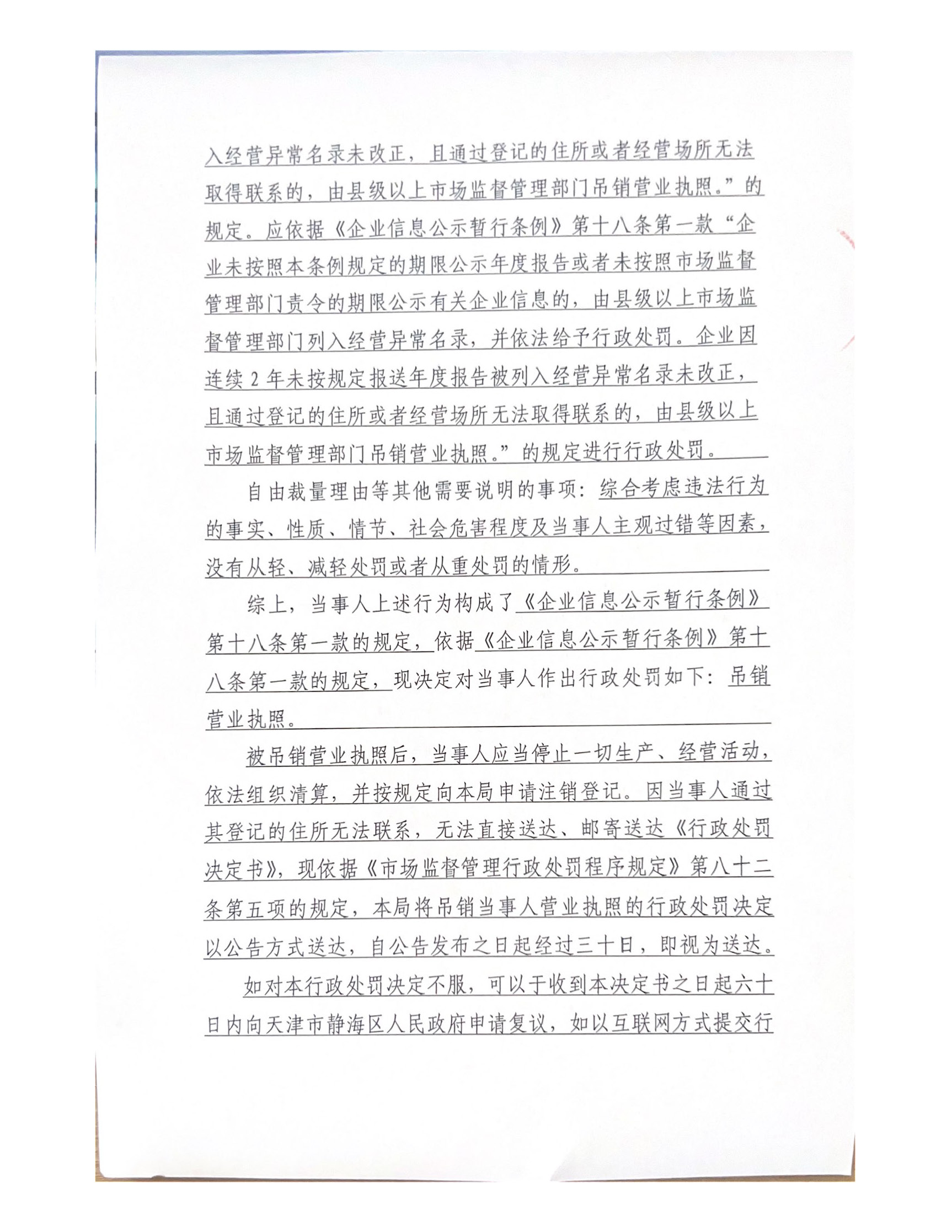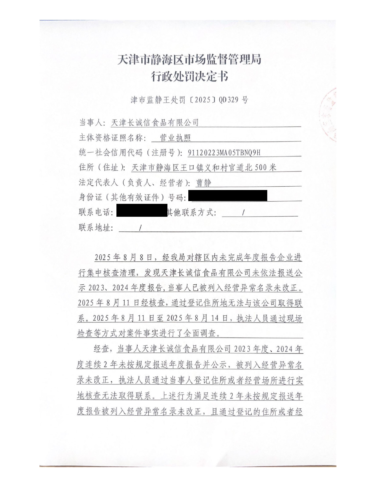 关于天津长诚信食品有限公司的吊销行政处罚决定书公告