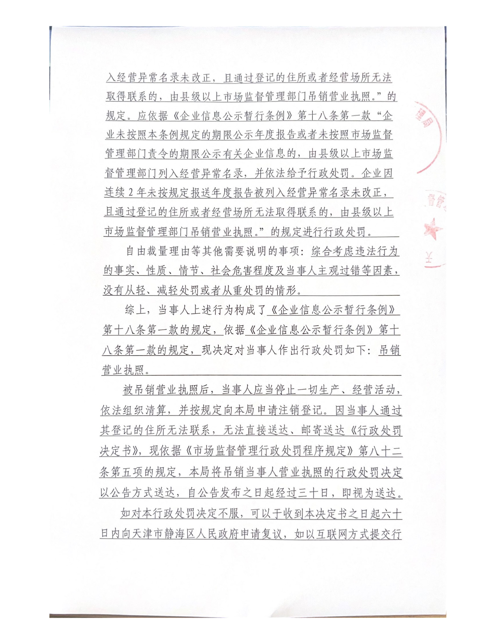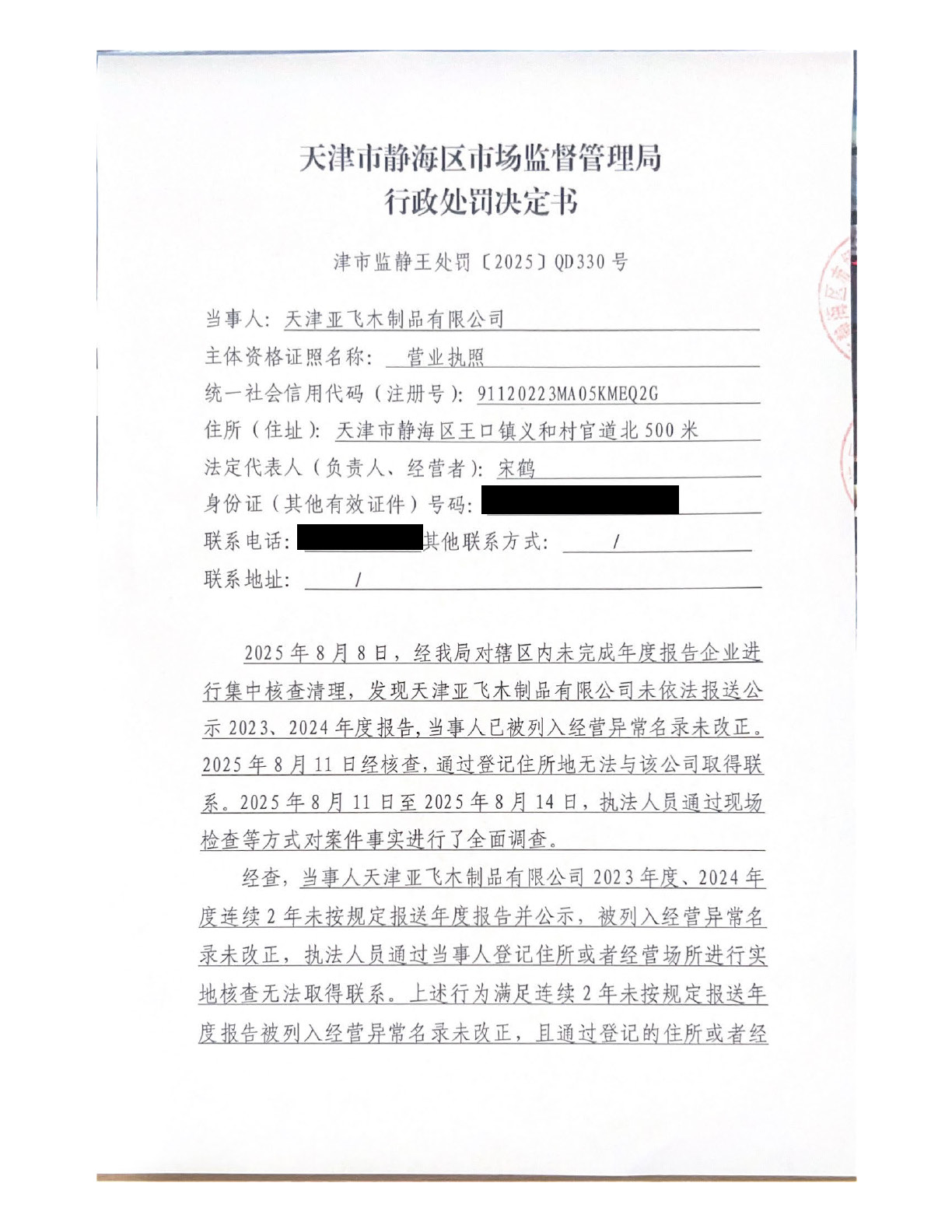 关于天津亚飞木制品有限公司的吊销行政处罚决定书公告