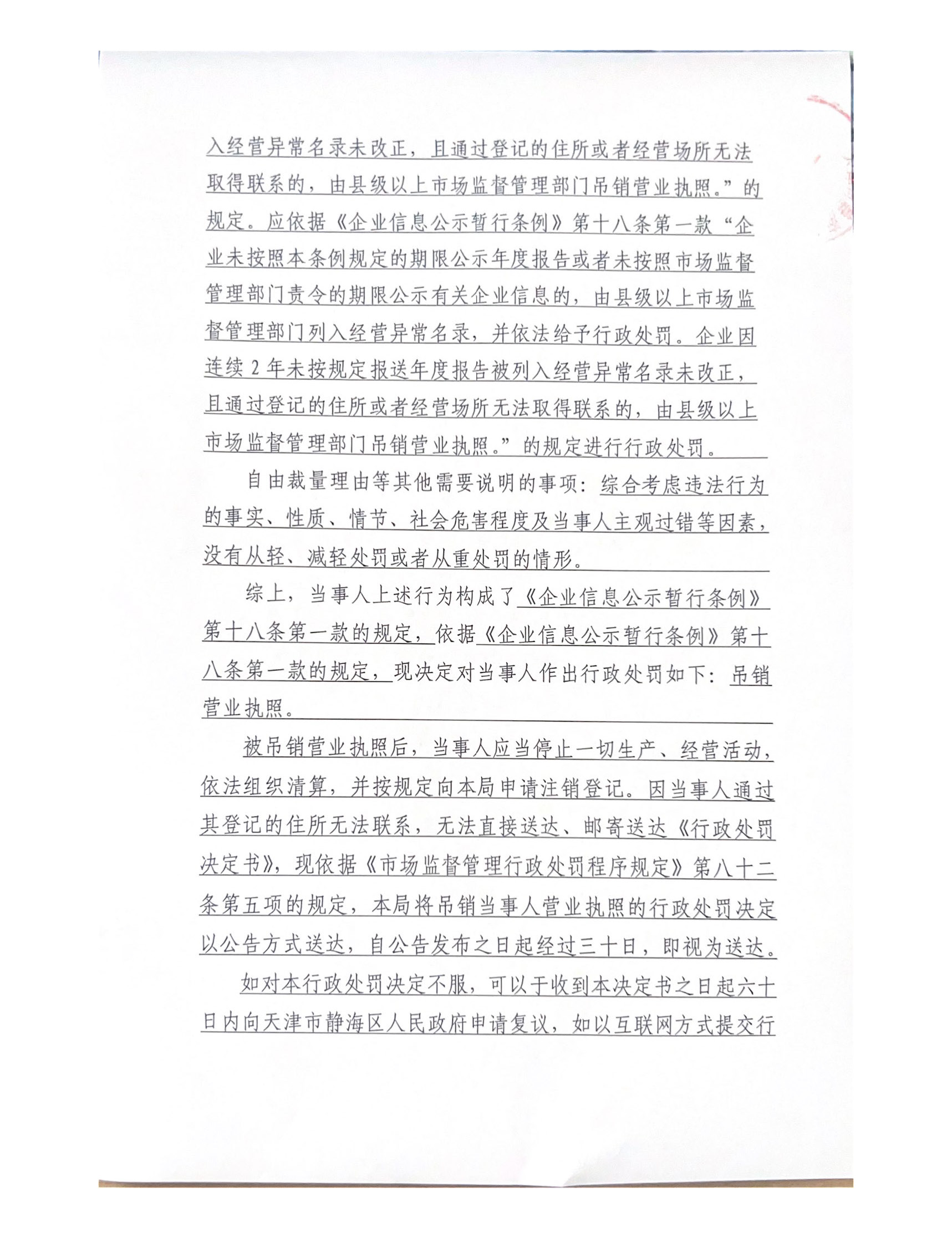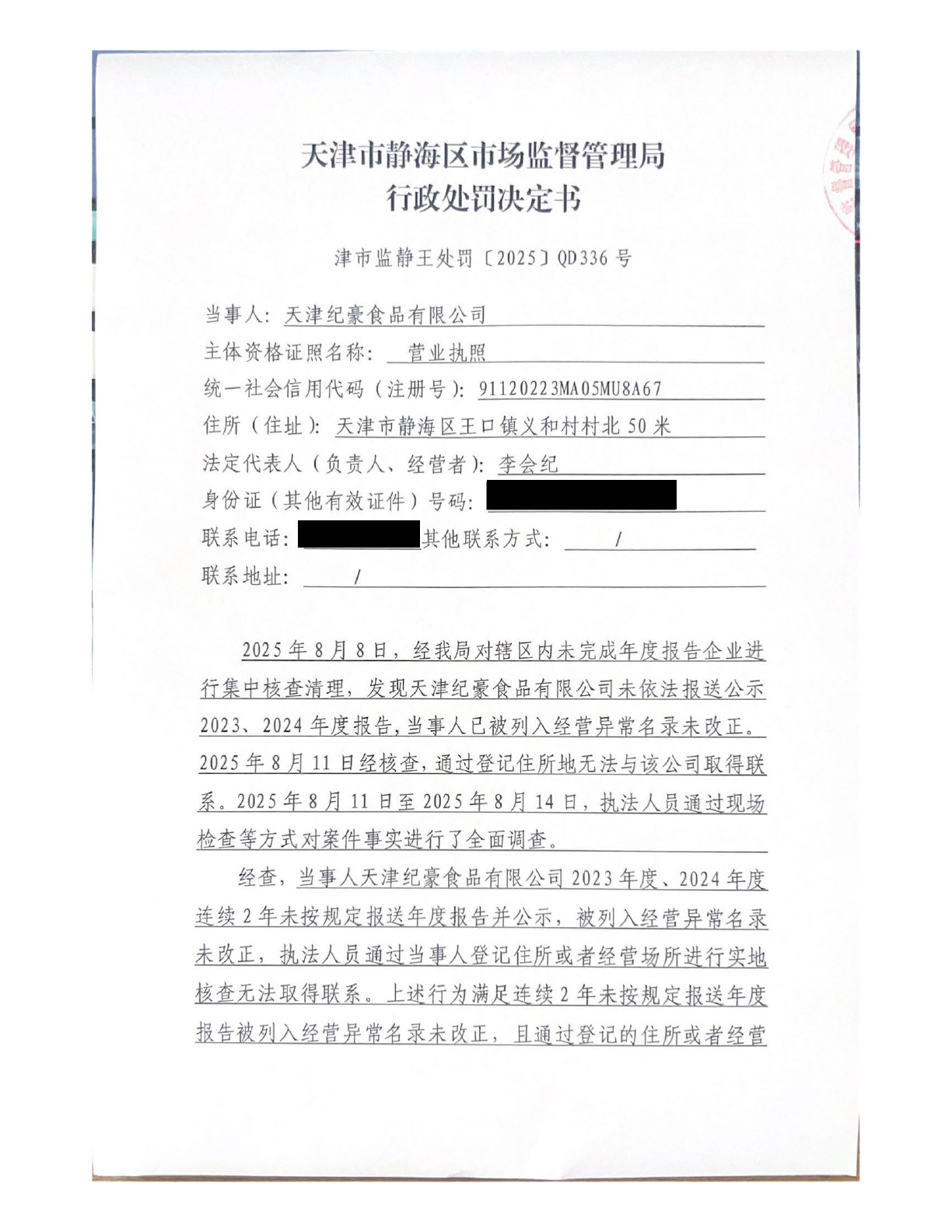 关于天津纪豪食品有限公司的吊销行政处罚决定书公告