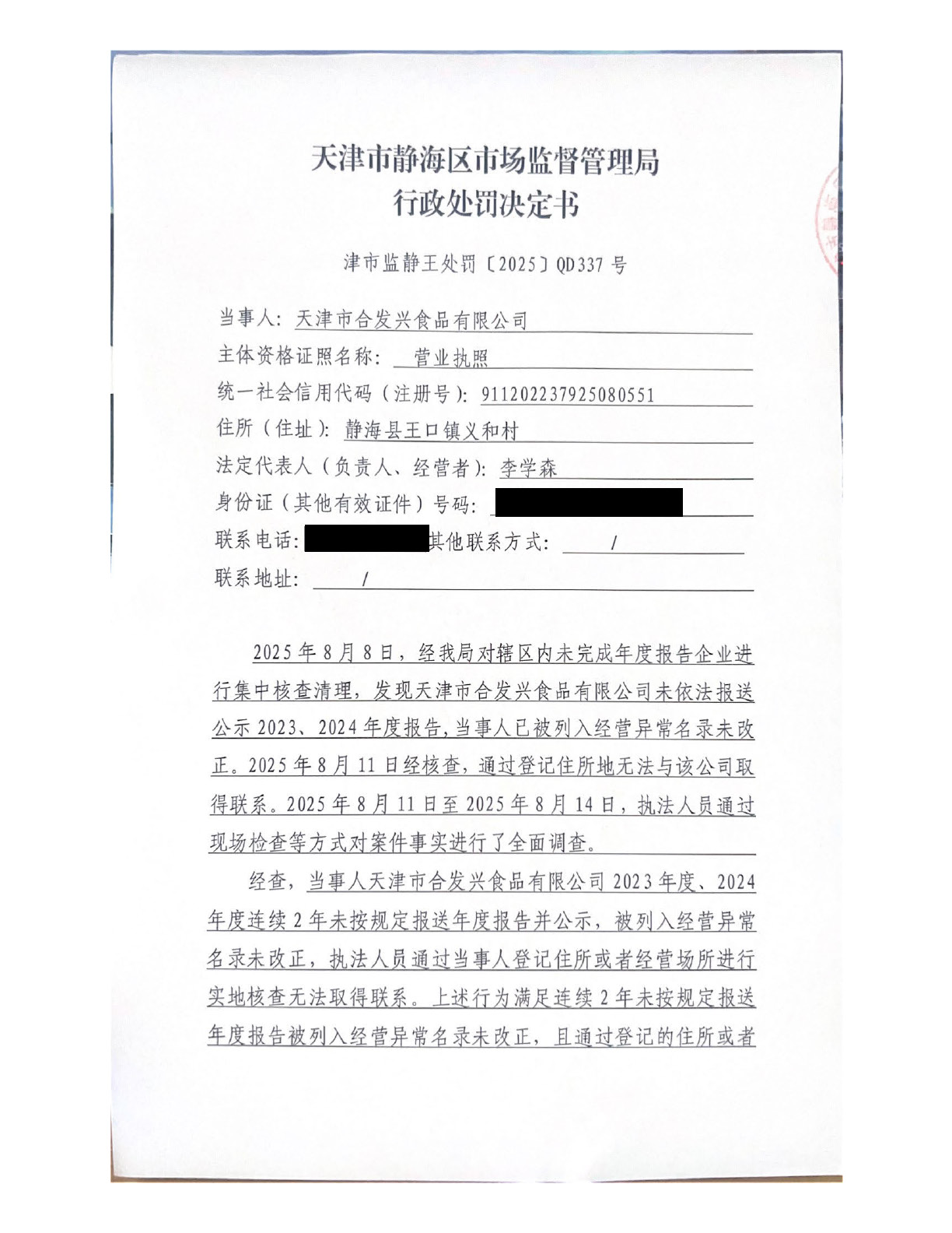 关于天津市合发兴食品有限公司的吊销行政处罚决定书公告