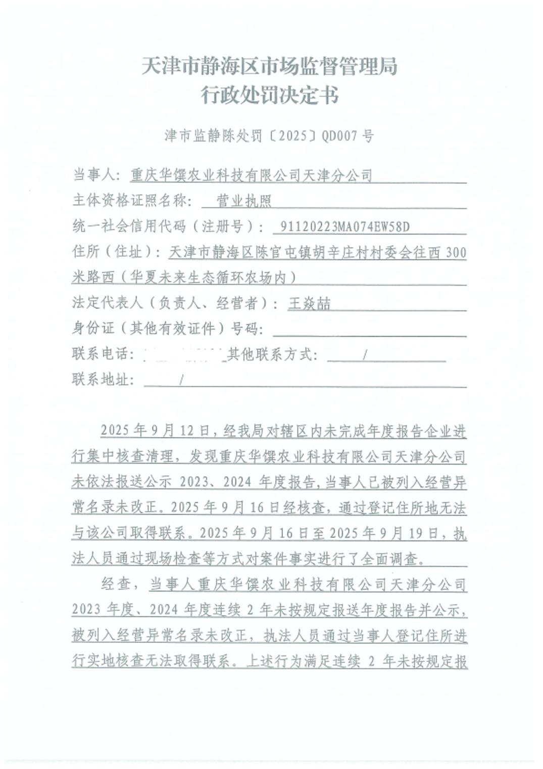 关于重庆华馔农业科技有限公司天津分公司的吊销行政处罚决定书公告