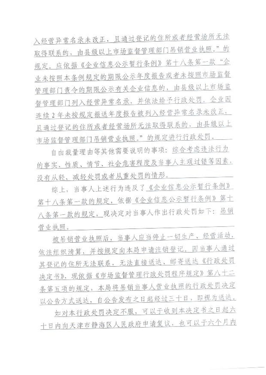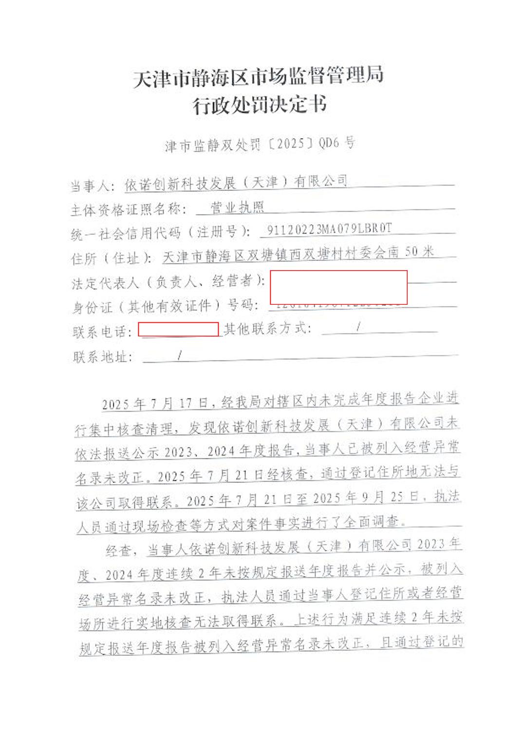 关于依诺创新科技发展(天津)有限公司的吊销行政处罚决定书公告