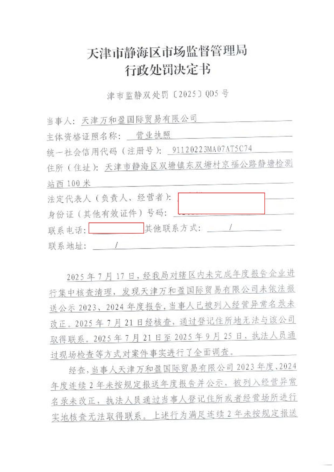关于天津万和盈国际贸易有限公司的吊销行政处罚决定书公告