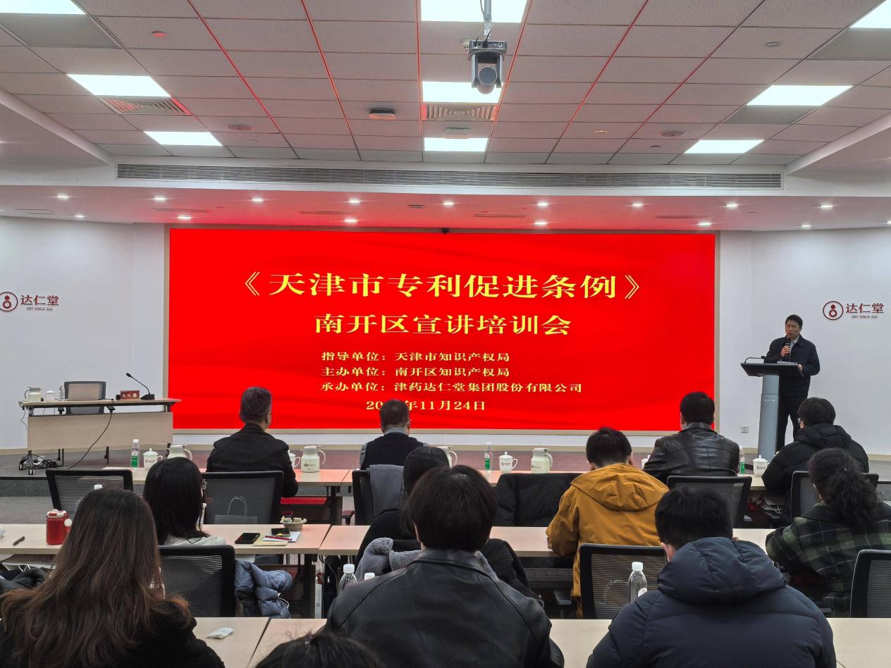 为深入贯彻落实《市知识产权局关于组织开展〈天津市专利促进条例〉宣贯活动的通知》精神,全面提升南开区专利创造、运用、保护、管理和服务水平,更好服务区域经济高质量发展,2025年11月24日,由天津市知识产权局指导,南开区市场监督管理局(知识产权局)主办,津药达仁堂集团股份有限公司承办的《天津市专利促进条例》(以下简称《条例》)宣贯培训活动成功举办。区市场监管局各监管所执法人员、区内高新技术企业、专精特新企业、知识产权优势示范企业代表、区内高等院校及科研院所知识产权管理部门工作人员、区内卫生医疗机构科研管理及成果转化工作人员等约60人参加了此次活动。