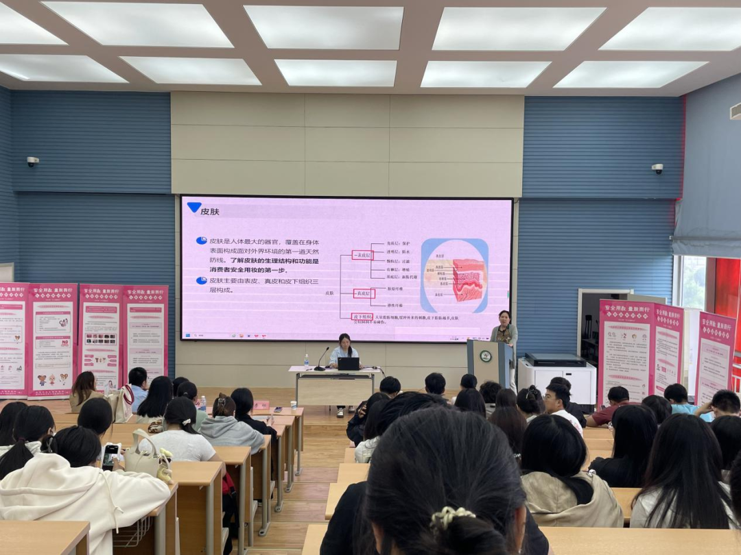 为加强化妆品不良反应监测工作,防范化妆品使用风险,构建安全的用妆环境,5月23日,市药监局联合市不良反应监测中心以“安全用妆,量肤而行”为主题,组织开展天津市“5·25爱肤日”宣传活动。活动主会场设在天津市生物工程职业技术学院,大学生的面部皮肤正处于青春期向成熟期的过渡阶段,易出现多种皮肤问题,为普及科学护肤理念,提升大学生的安全用妆意识,活动邀请天津市中医药研究院附属医院皮肤科李虹主任医师为学校师生们现场授课。李主任通过案例分析、互动问答等形式为现场师生们科普了化妆品不良反应的分类、表现及护肤技巧,并呼吁大家应根据自身肤质选择适合的化妆品,避免盲目选购化妆品。此次宣传活动生动地为学生们科普了化妆品不良反应知识,有效提升了广大师生对化妆品安全使用的科学认知,为营造健康、理性的校园化妆品消费环境奠定了良好基础。