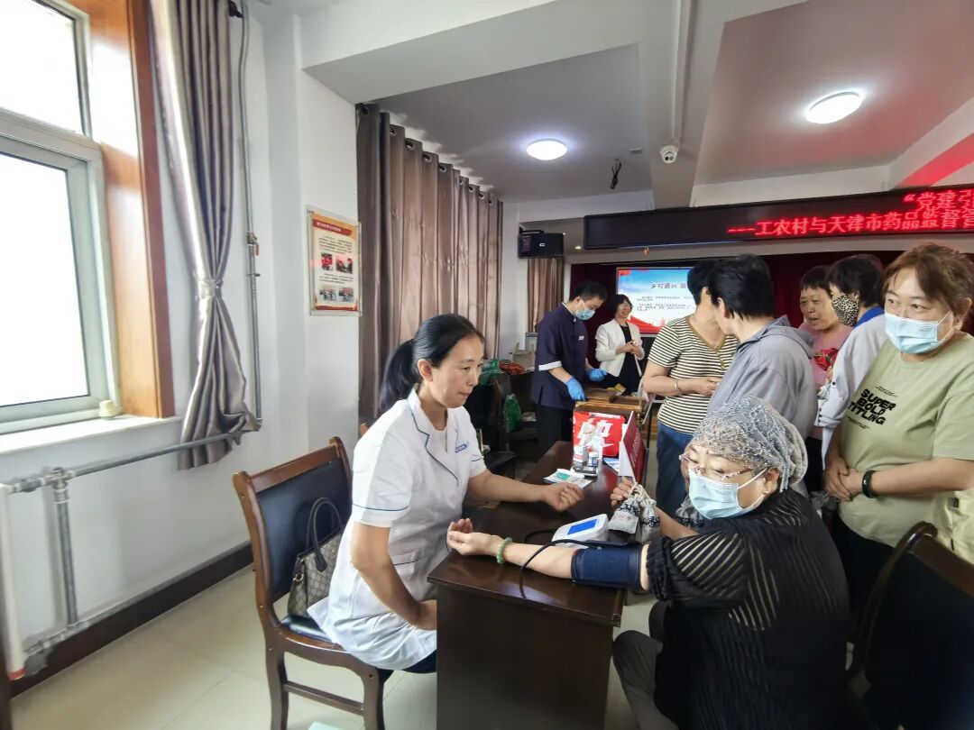 工农村活动现场设立了四个功能服务区,精准对接村民健康需求:安全用药科普区由第一监管办工作人员详细讲解家用血压计、血糖仪的使用要点及日常维护知识;暖心健康检测区由老百姓大药房工作人员为村民提供血压、血糖测量服务;中医药文化体验区在达仁堂中药传承人指导下,村民亲手制作香囊、山楂丸,体验中医药文化;健康科技互动区则提供弱视近视综合治疗仪等设备体验服务。活动伊始,津药达仁堂集团股份有限公司、快视(天津)科技有限公司、德中利德(天津)生物技术有限公司等三家爱心企业向村集体捐赠了弱视近视综合治疗仪、红外磁脉冲治疗仪等医疗设备。