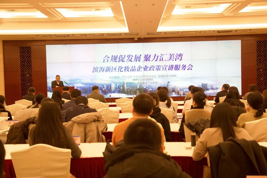 岁末收官擘蓝图,新规落地汇美湾。为助力滨海新区化妆品产业高质量发展、持续优化营商环境、搭建监管部门与企业沟通平台,深耕细作津沽美业共享提升实景图。12月19日,第一监管办携手化妆品监管处等多部门联合召开化妆品企业政策宣讲服务会。市药监局相关局领导出席会议并讲话,市药化审评查验中心、滨海新区市场监管局、经开区医药健康局等相关领导出席。会议邀请渤海美湾产业联盟、滨海新区化妆品生产企业、注备人、经营使用单位等100余名企业代表参加。