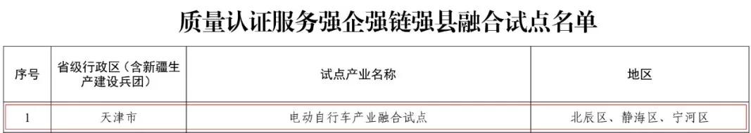 近日,国家认证认可监督管理委员会公布首批全国质量认证服务强企强链强县融合试点名单,我市申报的“电动自行车产业融合试点”入选。