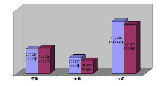 2010年,全市工商行政管理机关共受理社会咨询、申诉和举报104675件。其中,咨询89860件,同比下降13.78%;申诉9879件,同比上升3.58%;举报4936件,同比下降20.16%(见图一),为消费者挽回直接经济损失550.87万元,各类申诉举报办结率为97.22%。