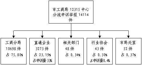 5.按分流路径划分。除各工商分局直接受理的申诉举报外,市工商局12315中心通过5条路径分流申诉举报14114件(见图四)。