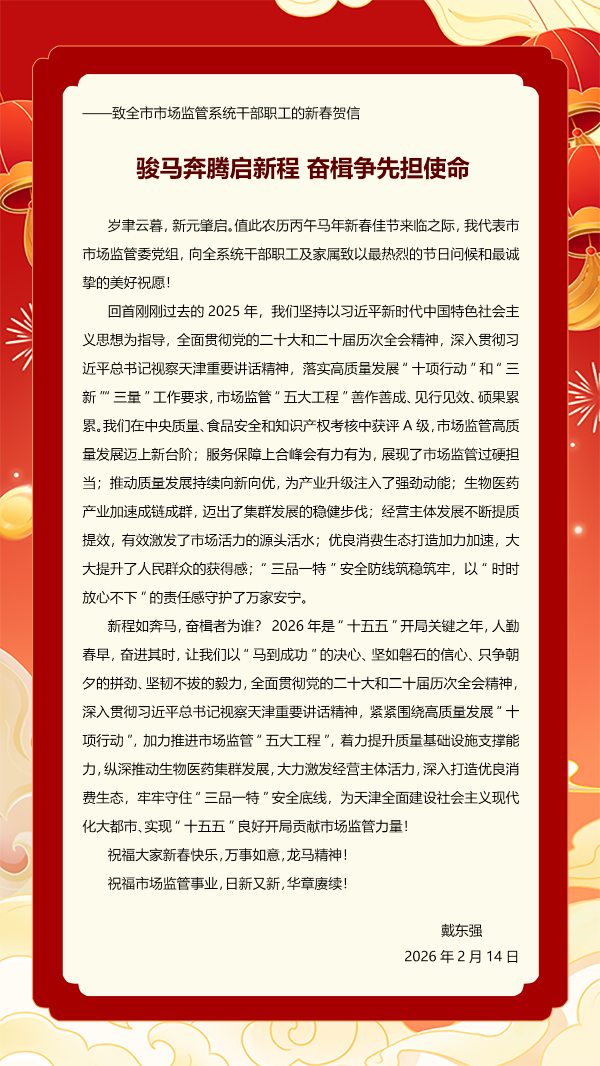 致全市市场监管系统干部职工的新春贺信