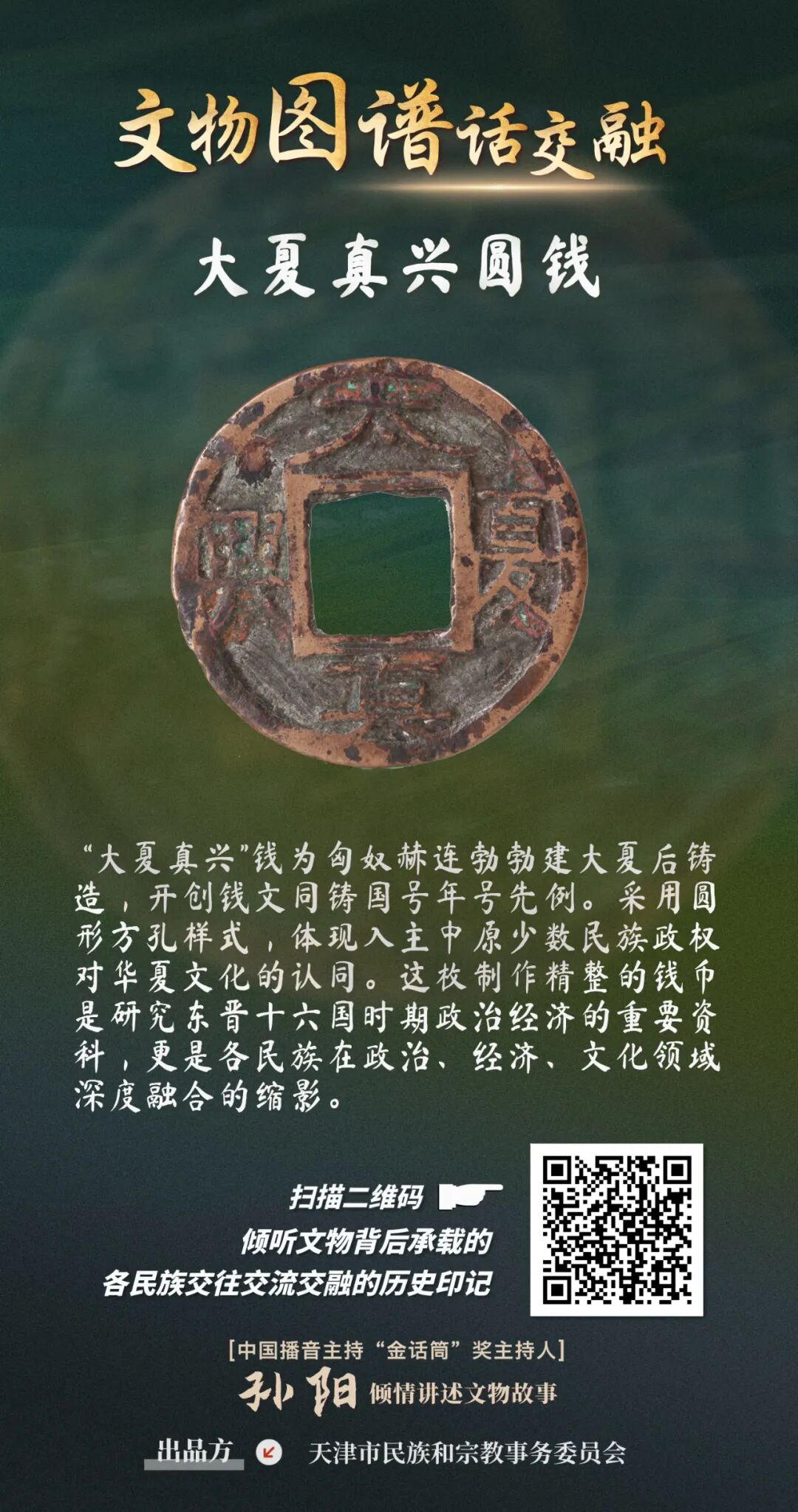 为进一步宣传贯彻落实习近平总书记关于加强和改进民族工作的重要思想以及习近平总书记视察天津重要讲话精神,牢牢把握新时代的文化使命,坚持以文化人、以文惠民、以文润城、以文兴业,在推动文化传承发展上善作善成,市民族宗教委紧紧把握铸牢中华民族共同体意识工作主线,从《中国民族文物图谱•天津市卷》中精选出珍贵文物,制作了23张“文物图谱话交融”为主题的有声海报,生动再现天津各民族广泛交往交流交融的历史故事。