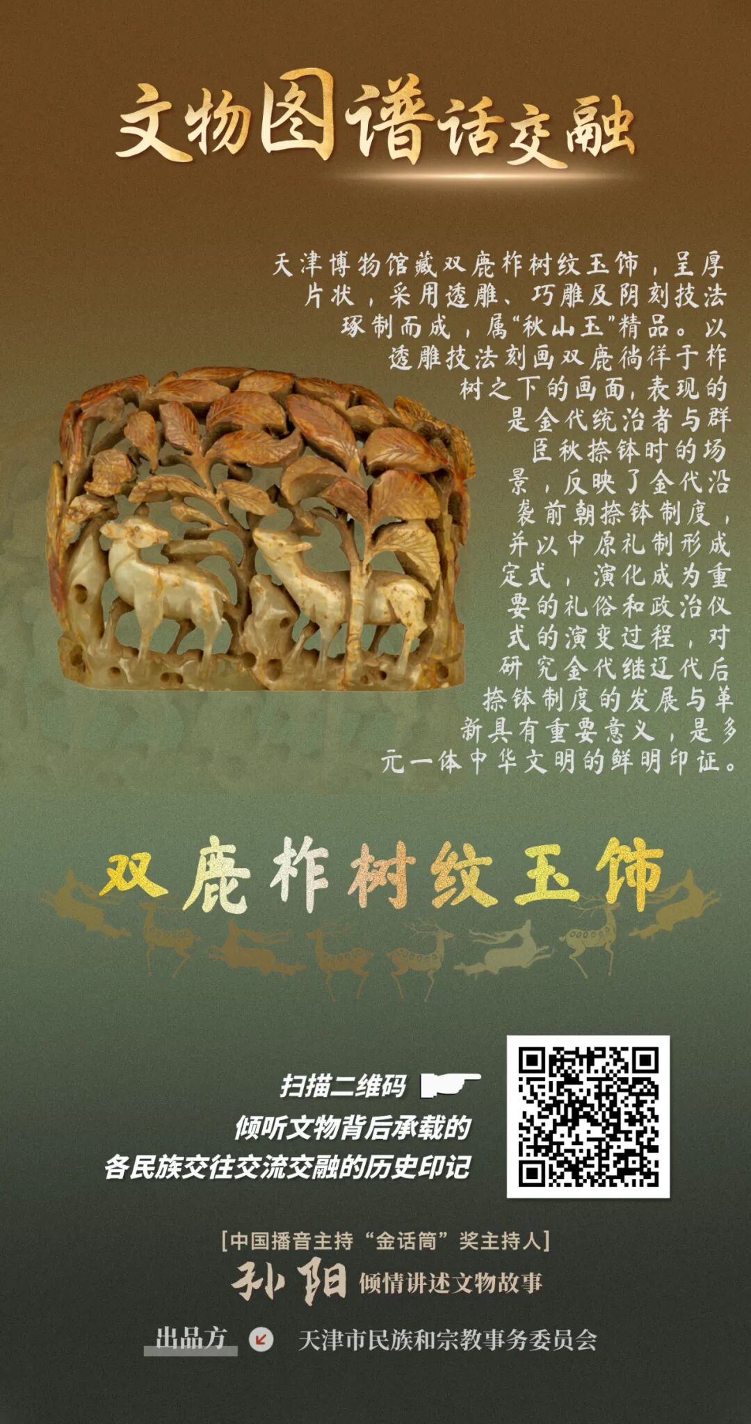 为进一步宣传贯彻落实习近平总书记关于加强和改进民族工作的重要思想以及习近平总书记视察天津重要讲话精神,牢牢把握新时代的文化使命,坚持以文化人、以文惠民、以文润城、以文兴业,在推动文化传承发展上善作善成,市民族宗教委紧紧把握铸牢中华民族共同体意识工作主线,从《中国民族文物图谱•天津市卷》中精选出珍贵文物,制作了23张“文物图谱话交融”为主题的有声海报,生动再现天津各民族广泛交往交流交融的历史故事。
