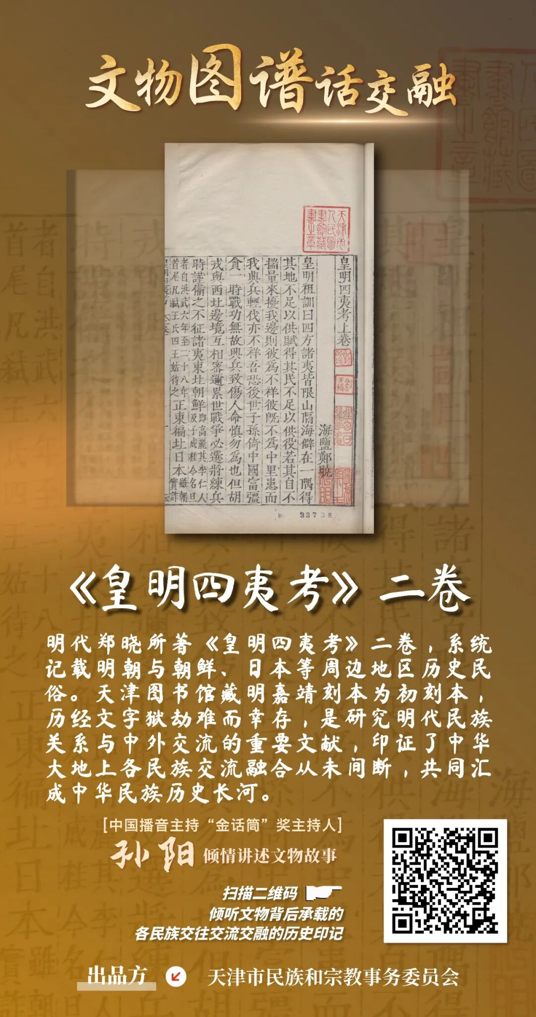 为进一步宣传贯彻落实习近平总书记关于加强和改进民族工作的重要思想以及习近平总书记视察天津重要讲话精神,牢牢把握新时代的文化使命,坚持以文化人、以文惠民、以文润城、以文兴业,在推动文化传承发展上善作善成,市民族宗教委紧紧把握铸牢中华民族共同体意识工作主线,从《中国民族文物图谱•天津市卷》中精选出珍贵文物,制作了23张“文物图谱话交融”为主题的有声海报,生动再现天津各民族广泛交往交流交融的历史故事。