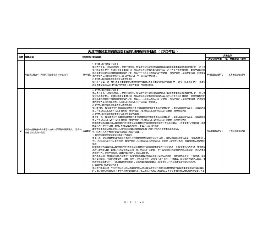 天津市市场监督管理综合行政执法事项指导目录(2025年版)