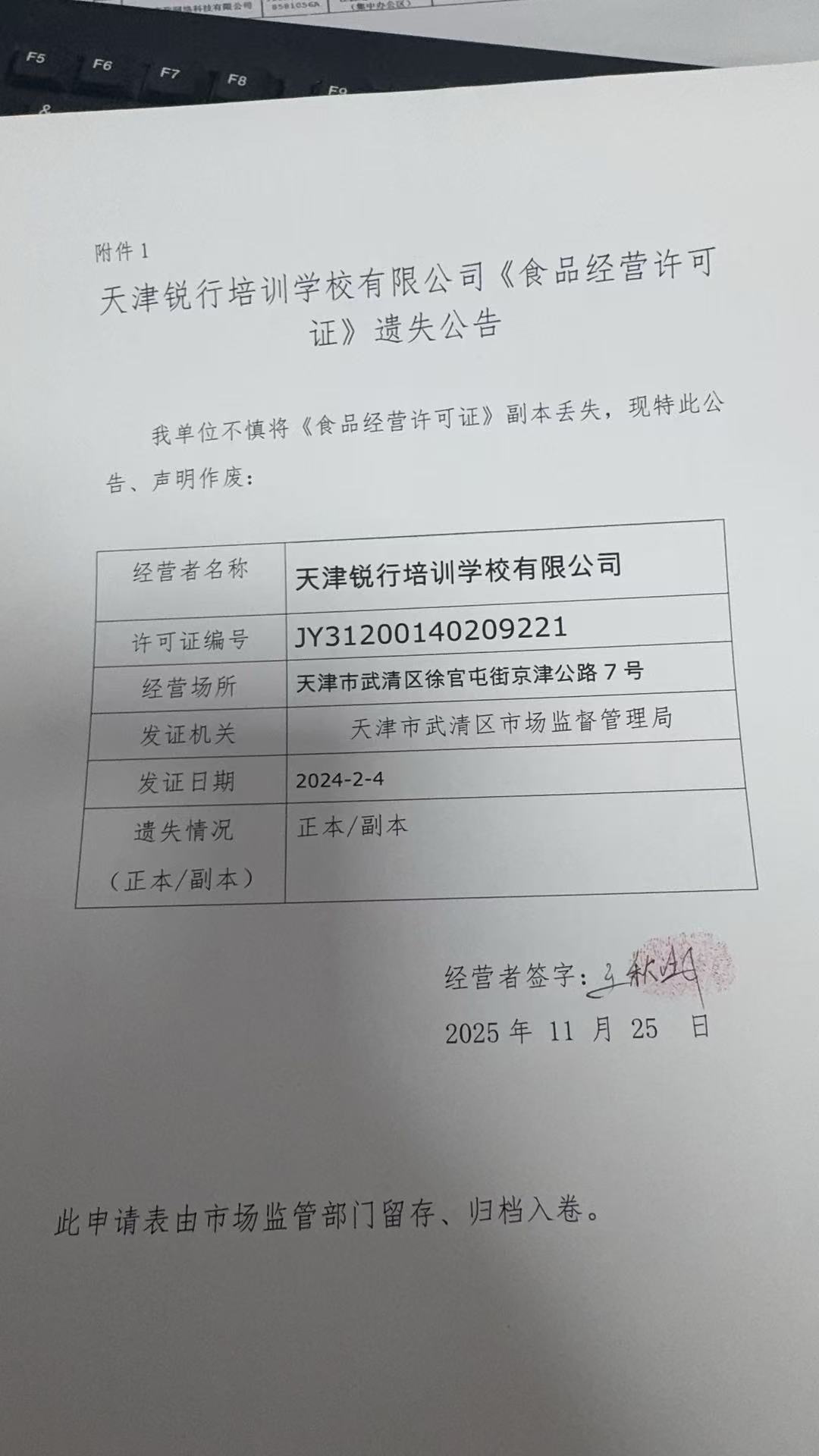 天津锐行培训学校有限公司《食品经营许可证》遗失公告