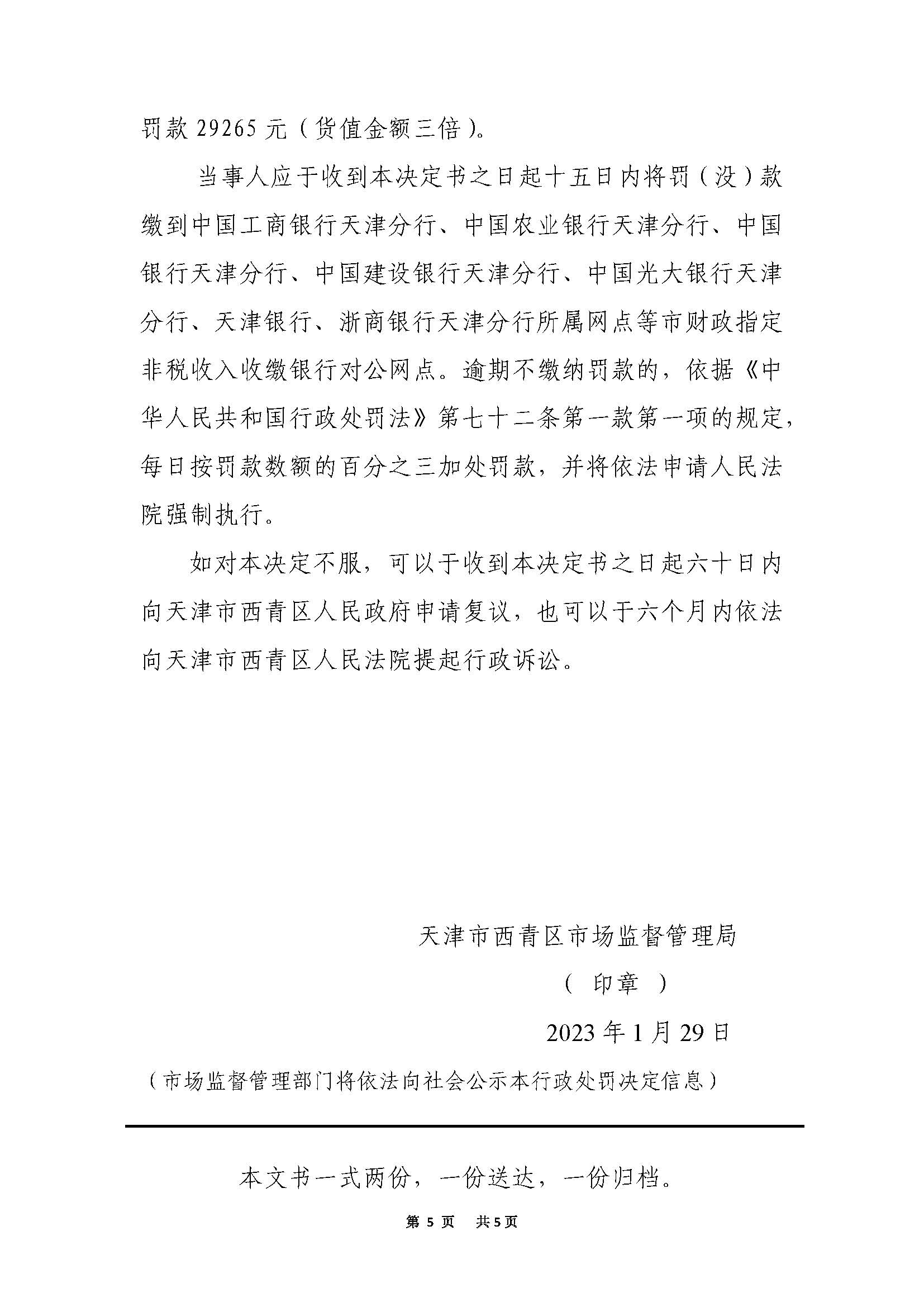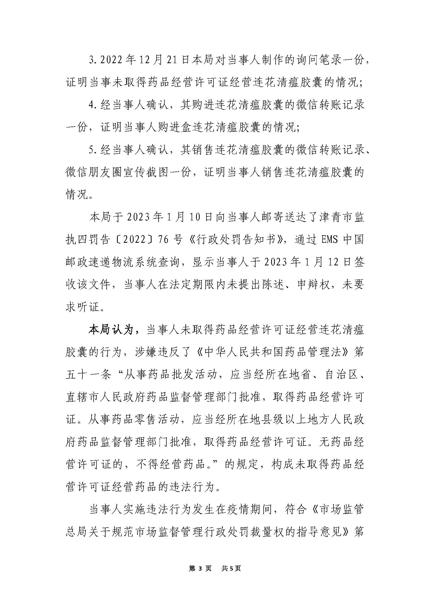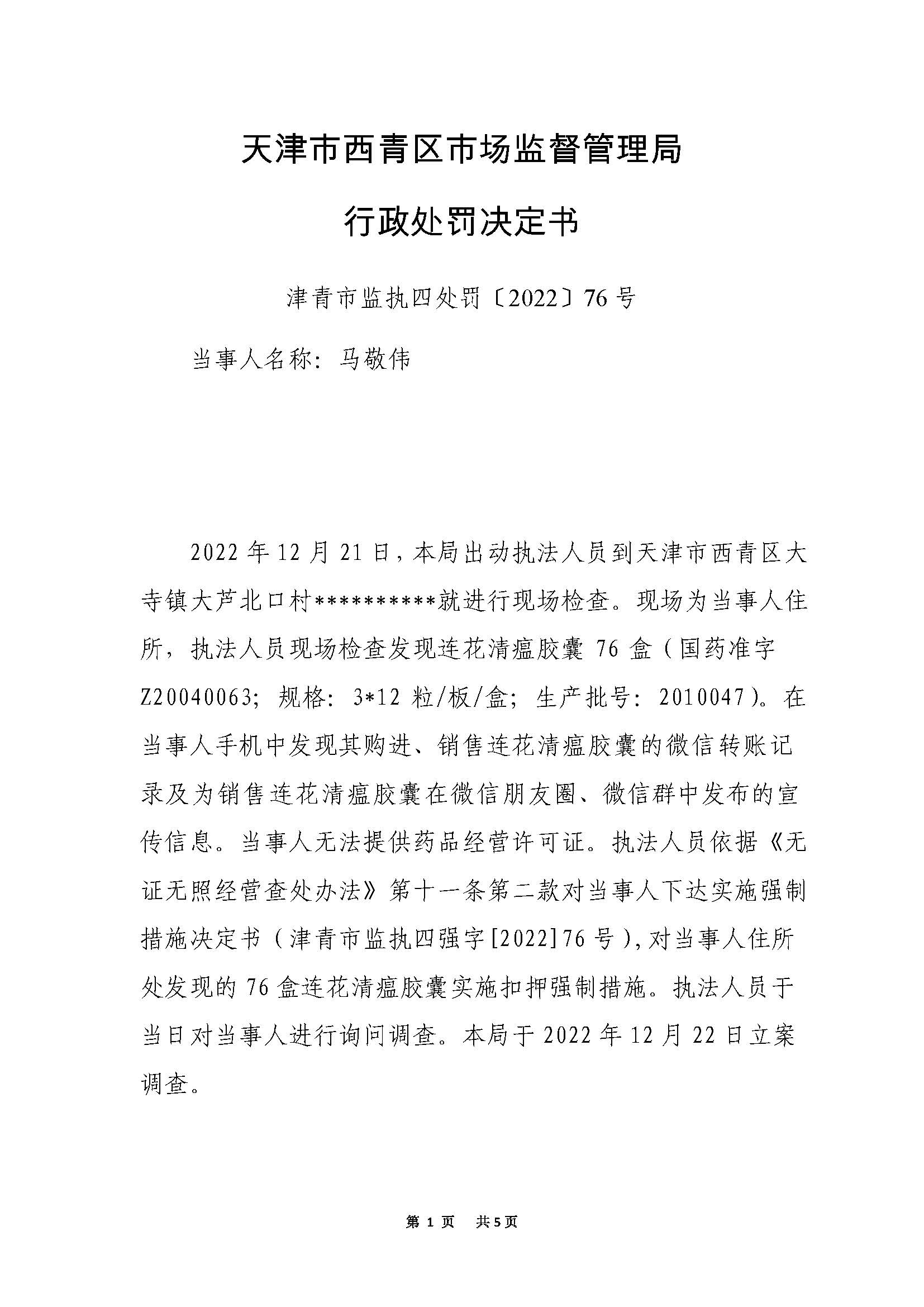 马敬伟未取得药品经营许可证经营连花清瘟胶囊案 | 马敬伟 | 津青市监执四处罚字〔2022〕76号 | 未取得药品经营许可证经营连花清瘟胶囊 | 1.没收违法经营的连花清瘟胶囊药品76盒;2.没收违法所得2020元;3.罚款29265元(货值金额三倍) | 《中华人民共和国药品管理法》第一百一十五条 | 主动履行15日 | 天津市西青区市场监督管理局 | 2023年1月29日 | |||||